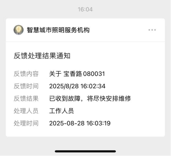 市民通过手机扫码,可便捷使用两大核心功能:一是快速报修,系统自动关联灯杆位置,维修人员实时接收信息并精准定位,省去市民自行描述位置环节;二是维修完成后,市民可通过平台及时收到处理结果反馈,形成服务闭环。