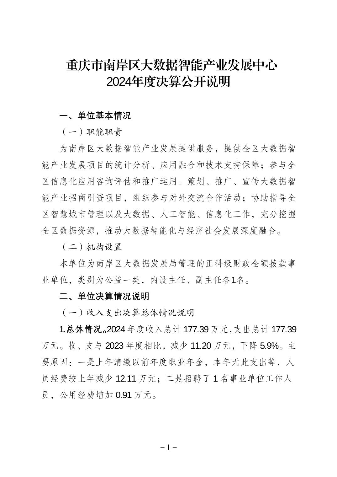 重庆市南岸区大数据智能产业发展中心2024年度决算公开说明