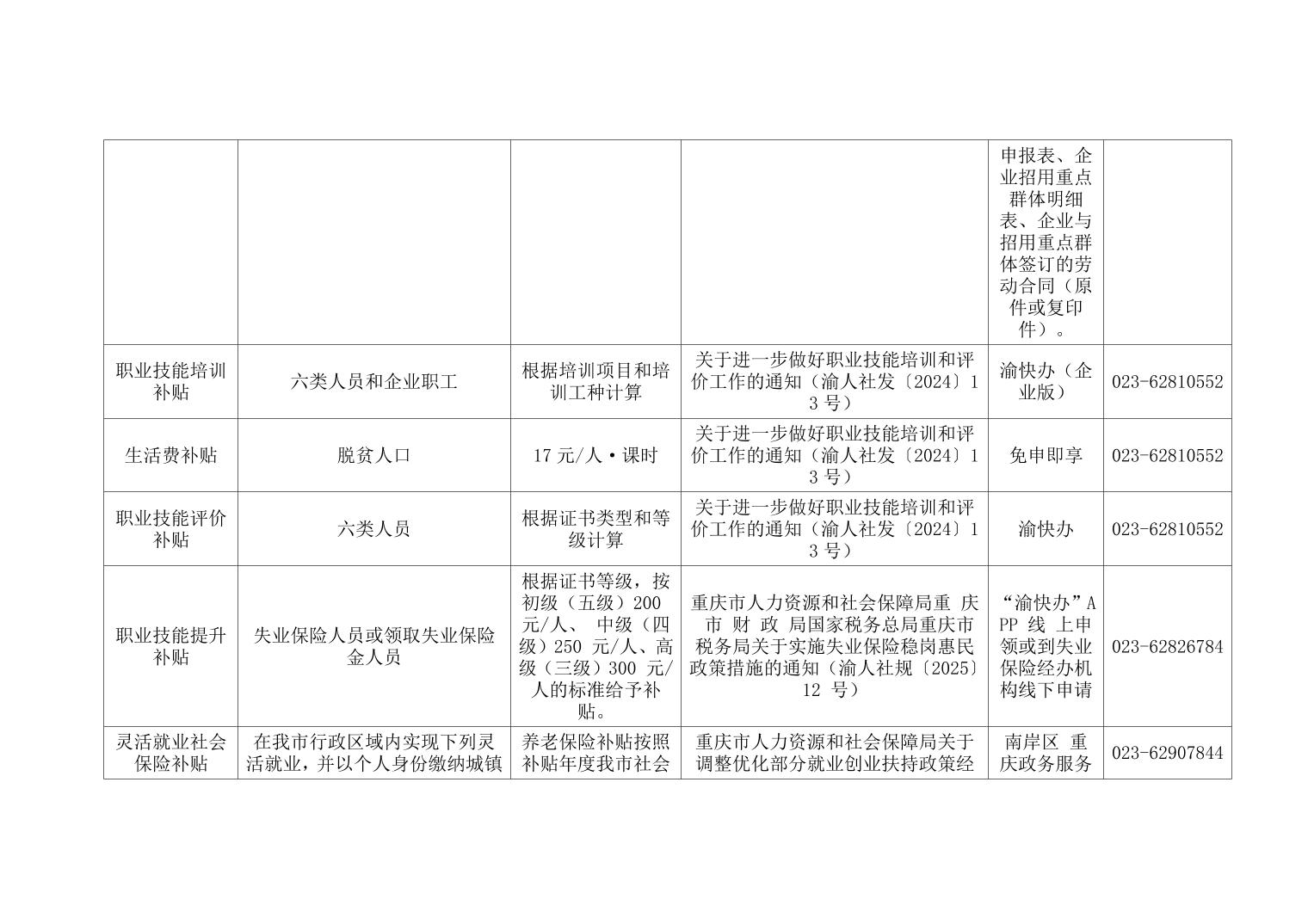 重庆市南岸区人力社保局惠民惠农财政补贴政策清单