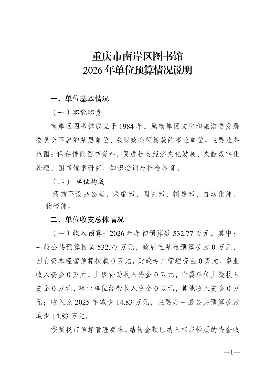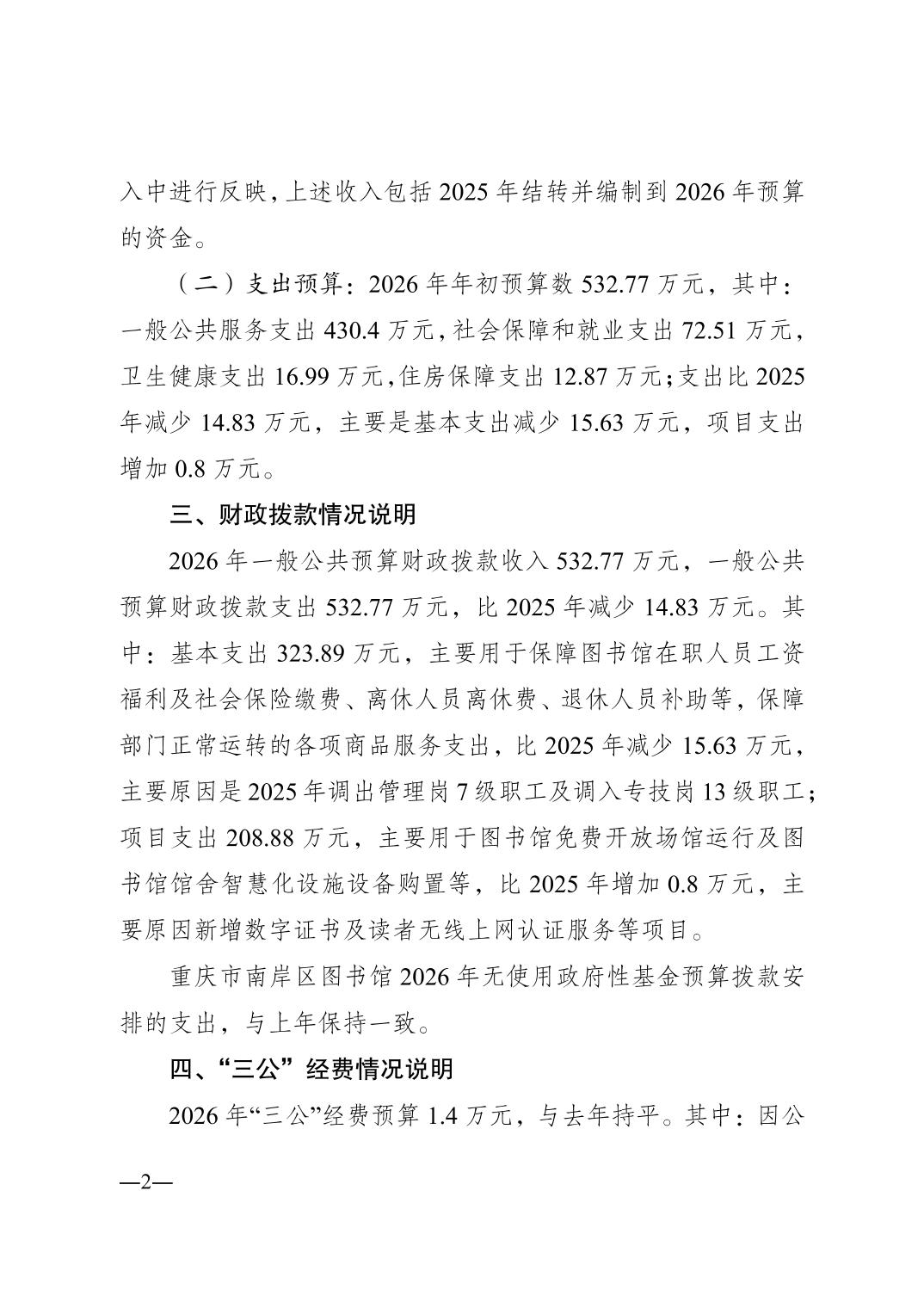 重庆市南岸区图书馆2026年单位预算情况说明