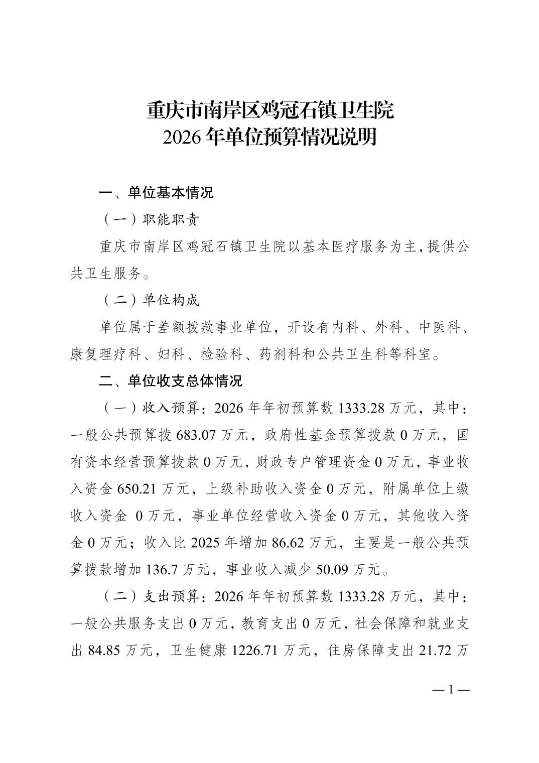 重庆市南岸区鸡冠石镇卫生院2026年单位预算情况说明