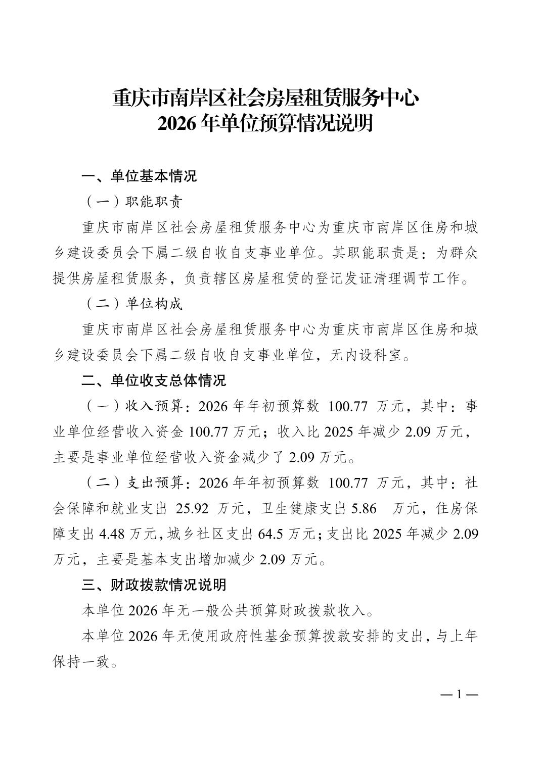 重庆市南岸区社会房屋租赁服务中心2026年单位预算情况说明