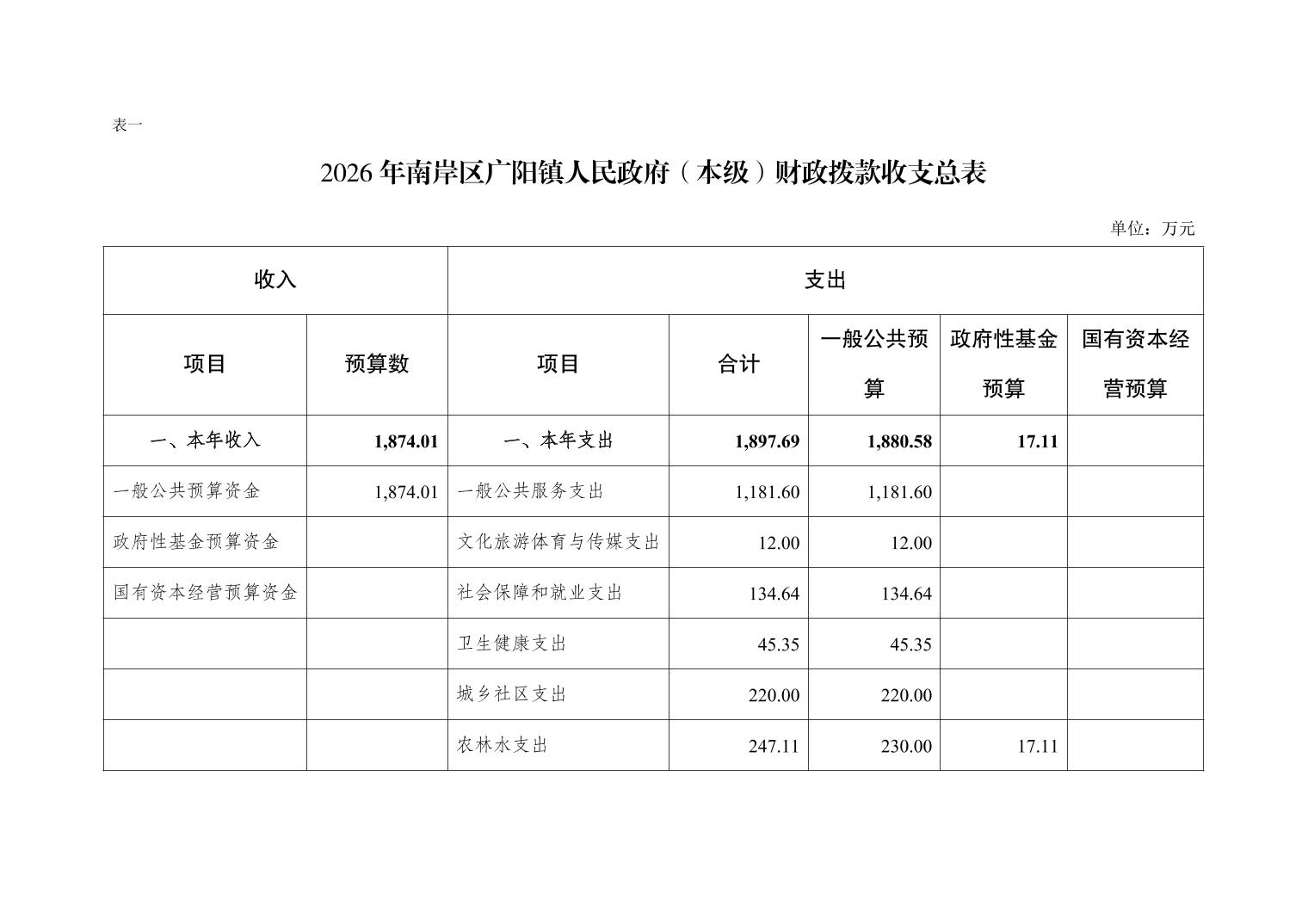 重庆市南岸区广阳镇人民政府(本级)2026年单位预算情况说明