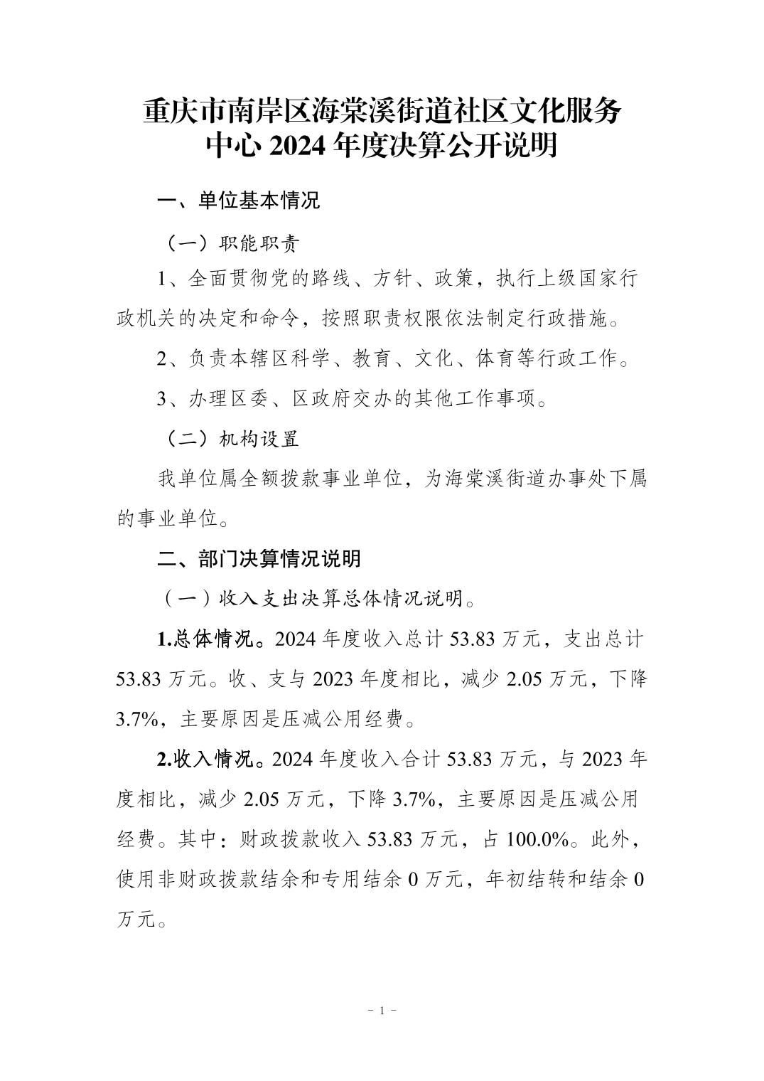 重庆市南岸区海棠溪街道社区文化服务中心 2024 年度决算公开说明