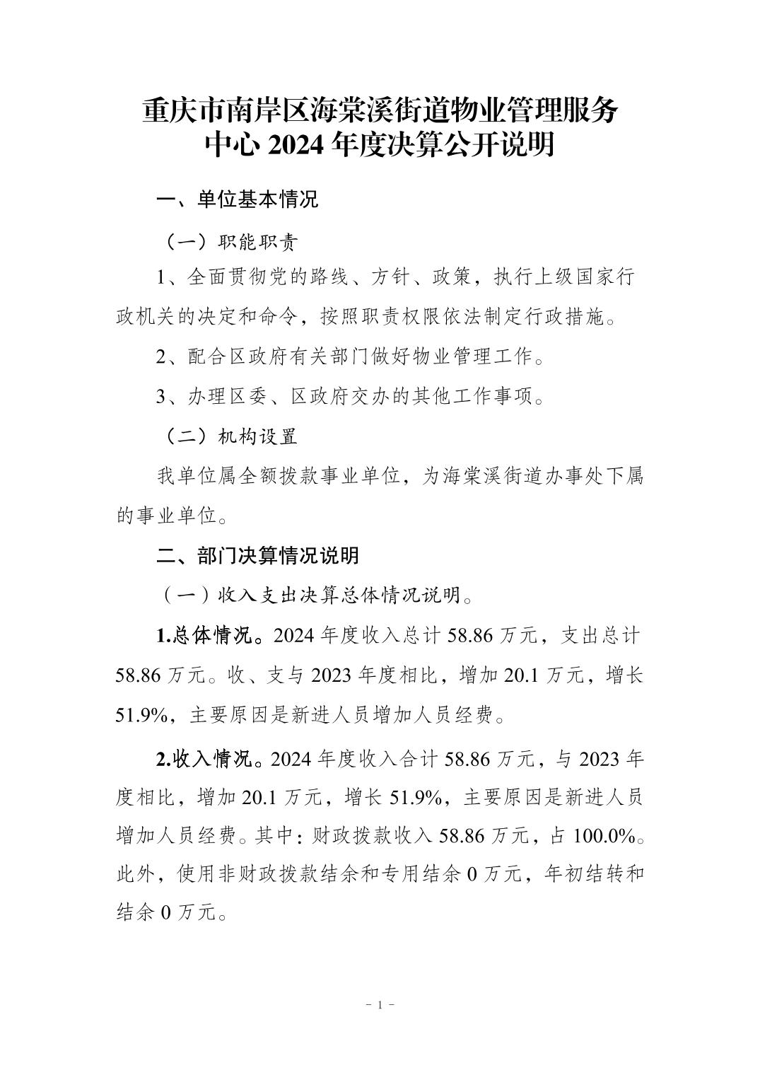 重庆市南岸区海棠溪街道物业管理服务中心 2024 年度决算公开说明