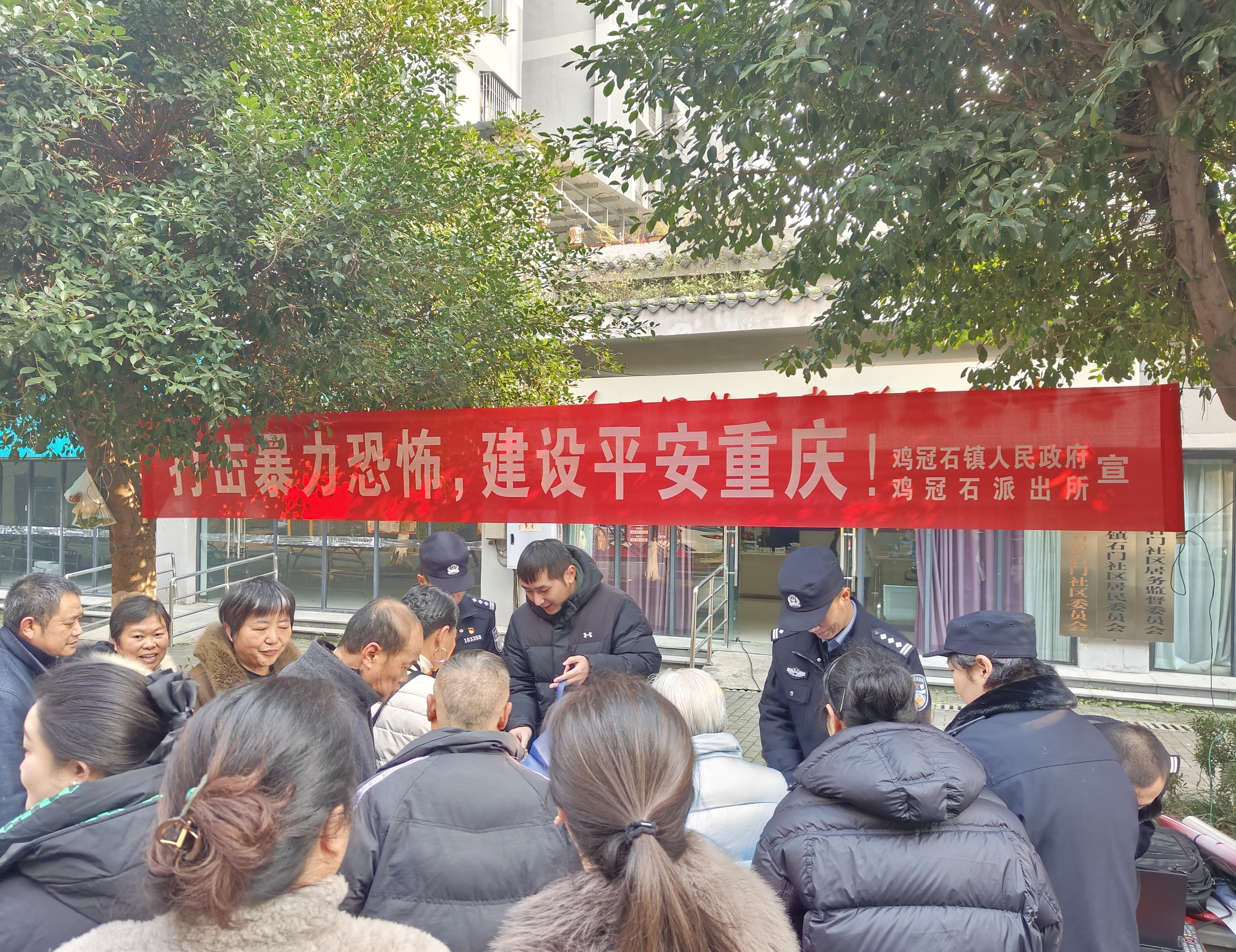 近日,鸡冠石镇人民政府联合辖区派出所共同开展“打击暴力恐怖,建设平安重庆”主题宣传活动,着力增强群众反恐防暴意识,筑牢辖区平安防线,营造和谐稳定的社会环境。