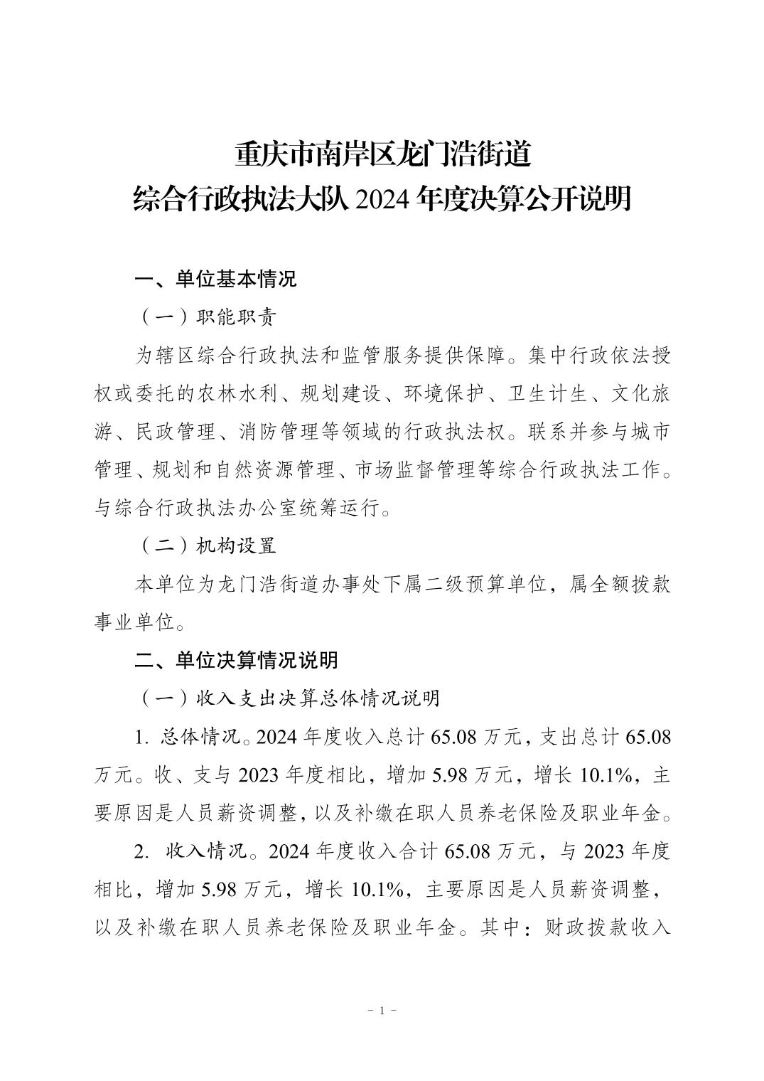 重庆市南岸区龙门浩街道综合行政执法大队2024年度部门决算公开说明