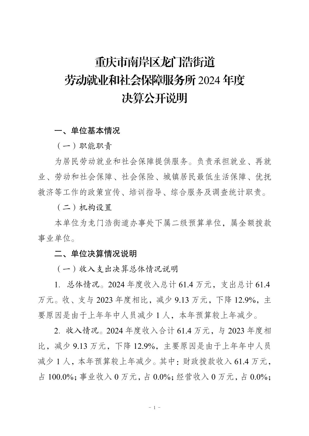 重庆市南岸区龙门浩街道劳动就业和社会保障服务所2024年度部门决算公开说明