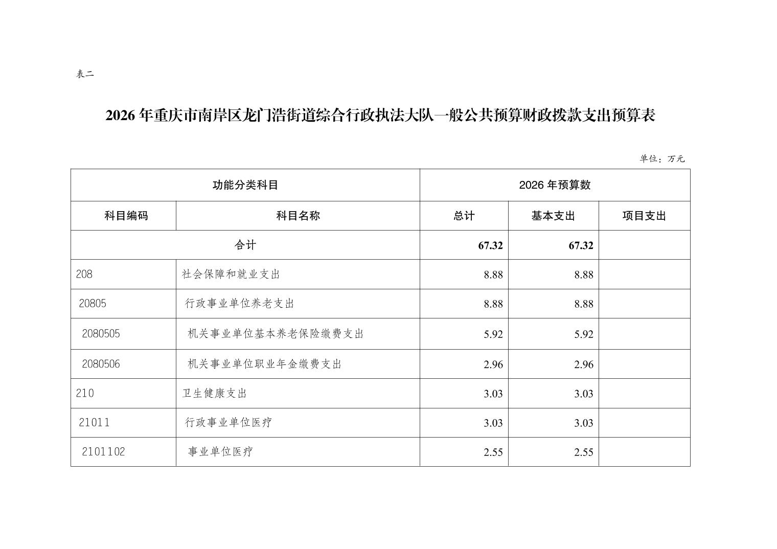 重庆市南岸区龙门浩街道综合行政执法大队2026年单位预算情况说明