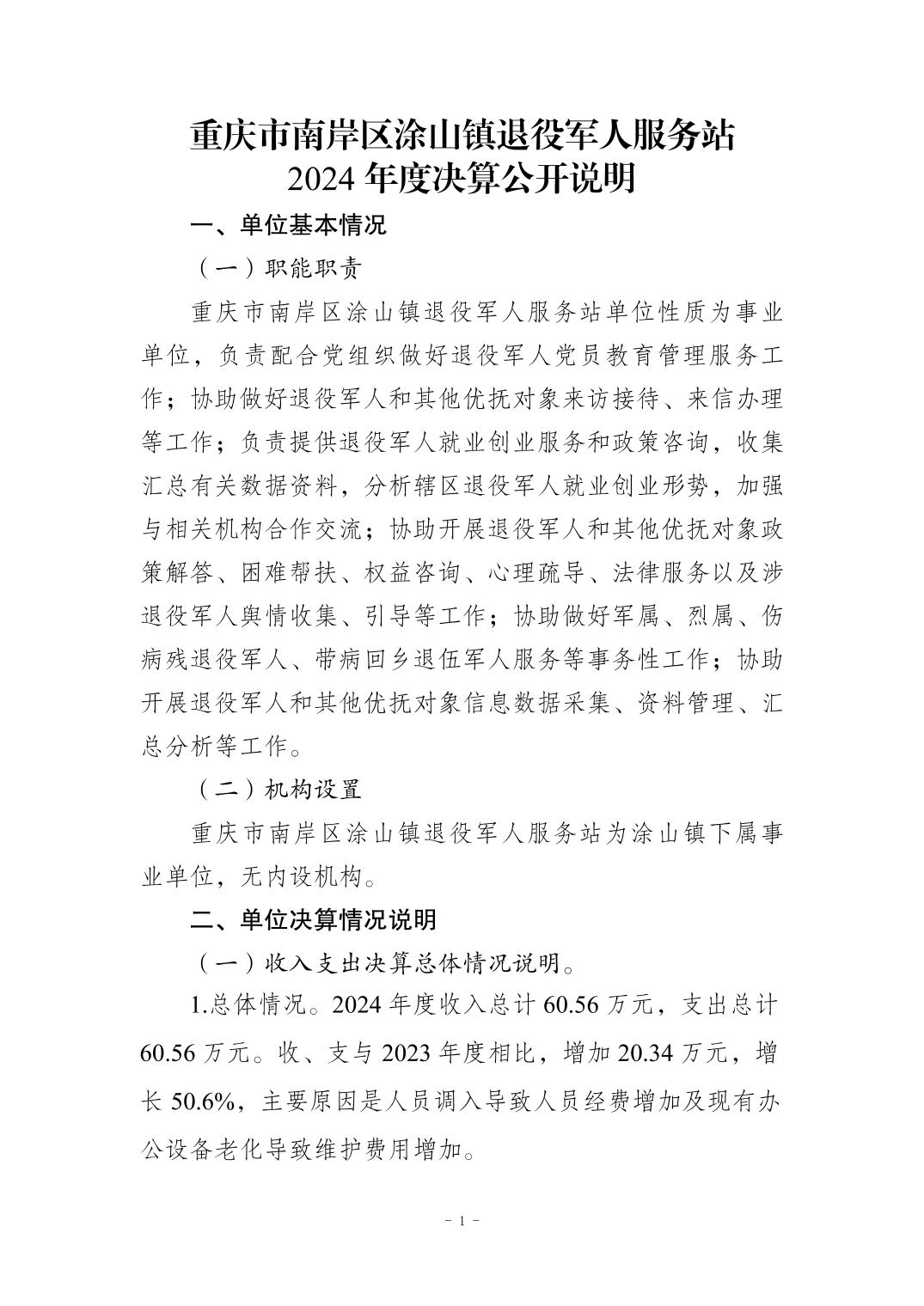 重庆市南岸区涂山镇退役军人服务站2024 年度决算公开说明