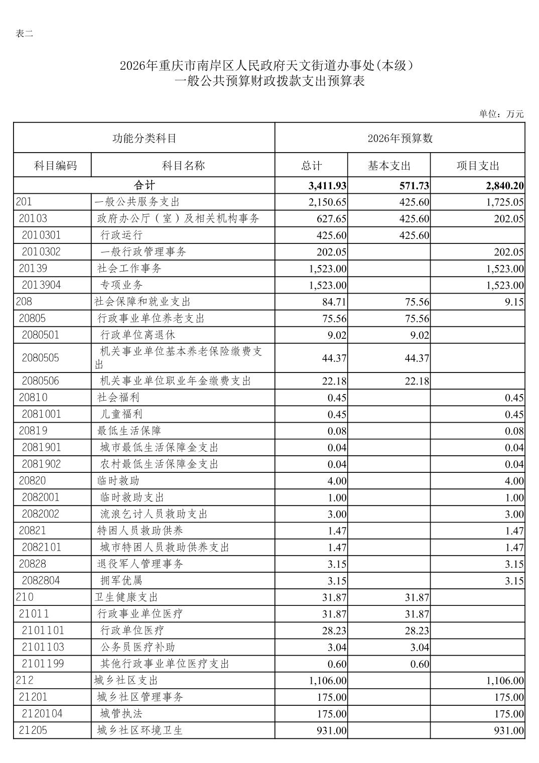 重庆市南岸区人民政府天文街道办事处(本级)2026年单位预算情况说明
