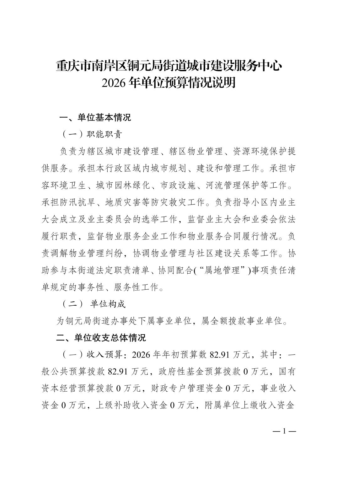 重庆市南岸区铜元局街道城市建设服务中心2026年单位预算情况说明