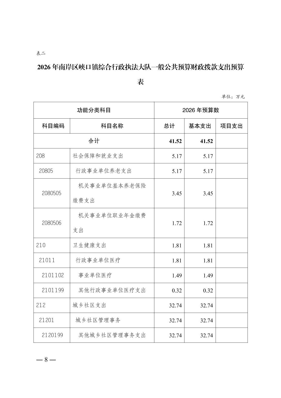 重庆市南岸区峡口镇综合行政执法大队2026年单位预算情况说明