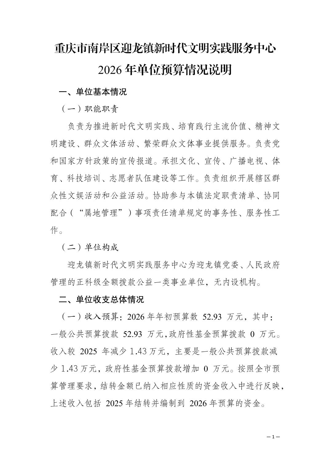 重庆市南岸区迎龙镇新时代文明实践服务中心2026年单位预算情况说明