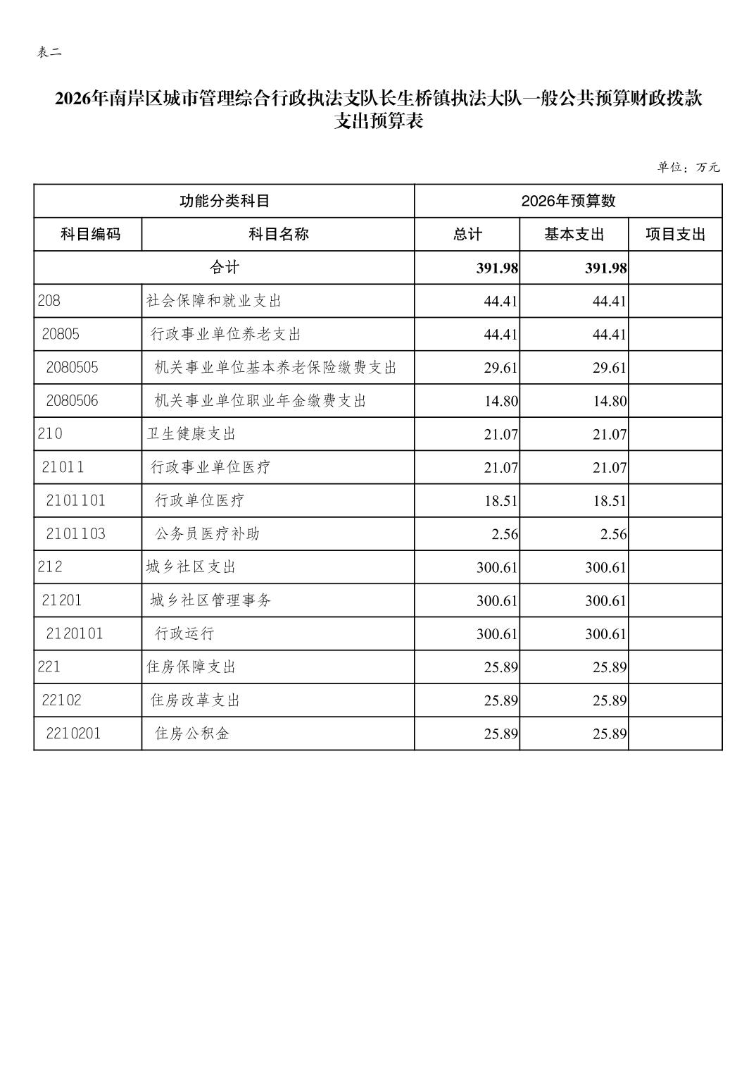 重庆市南岸区城市管理综合行政执法支队长生桥镇执法大队2026年单位预算情况说明