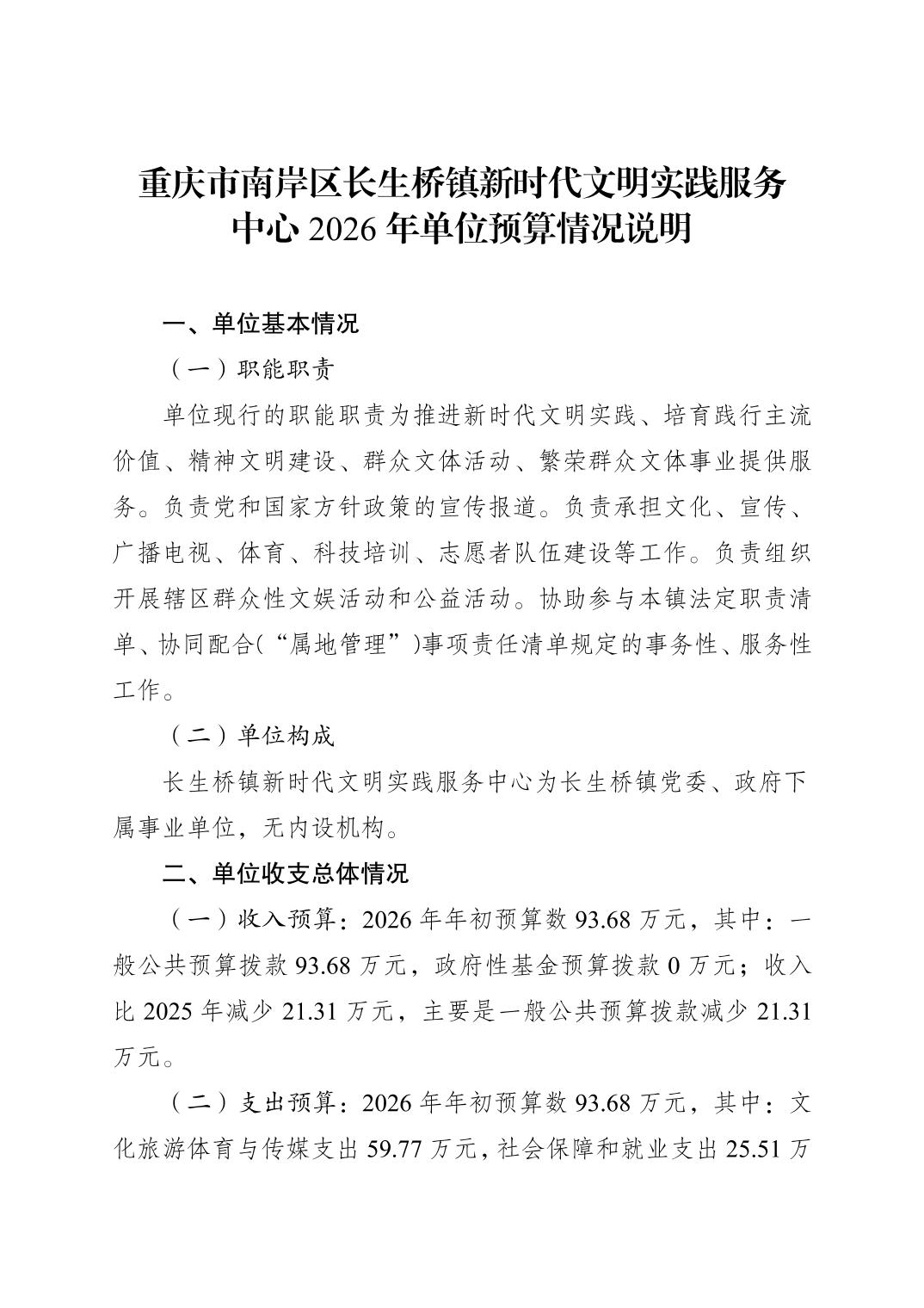 重庆市南岸区长生桥镇新时代文明实践服务中心2026年单位预算情况说明
