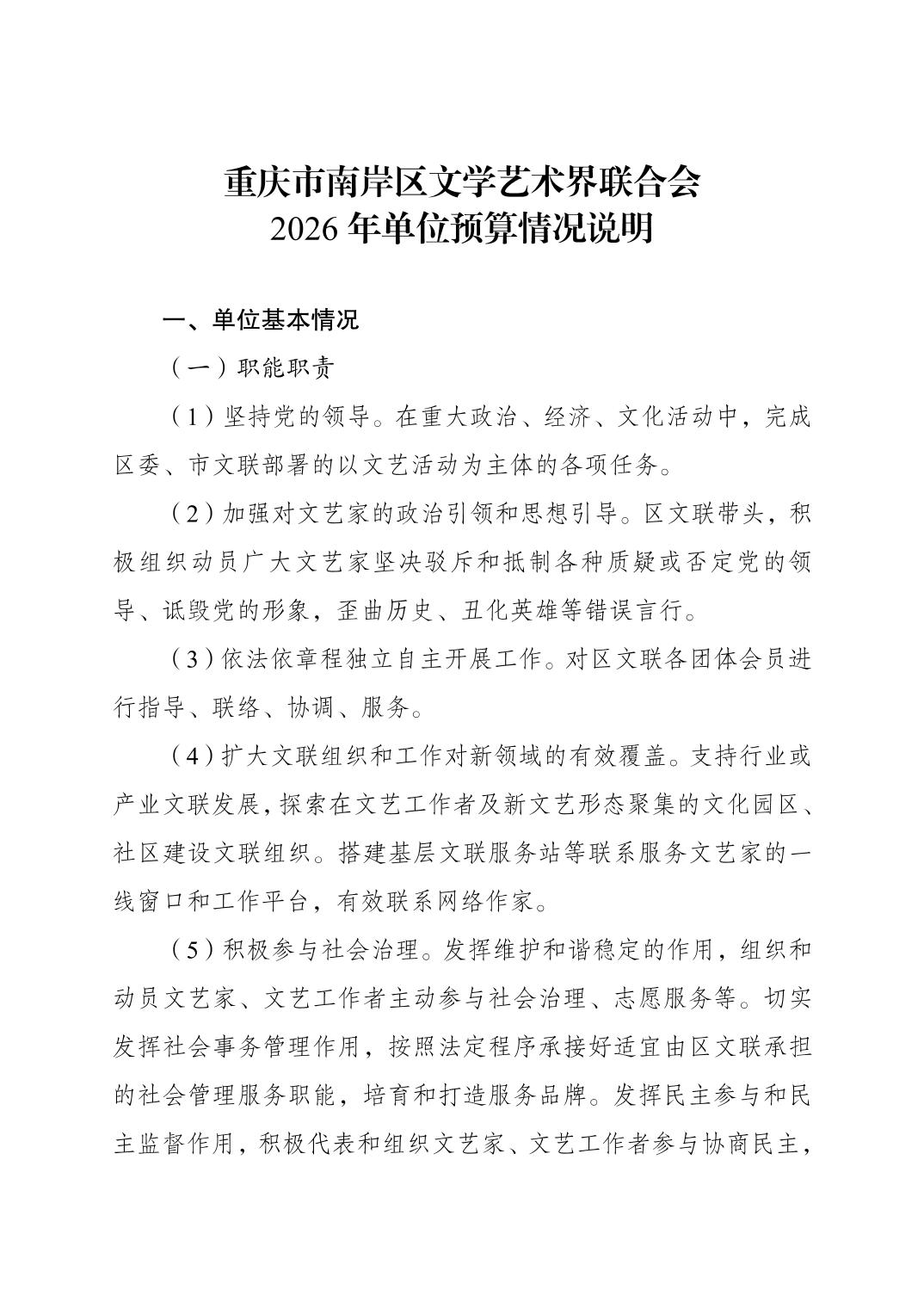 重庆市南岸区文学艺术界联合会2026年单位预算情况说明