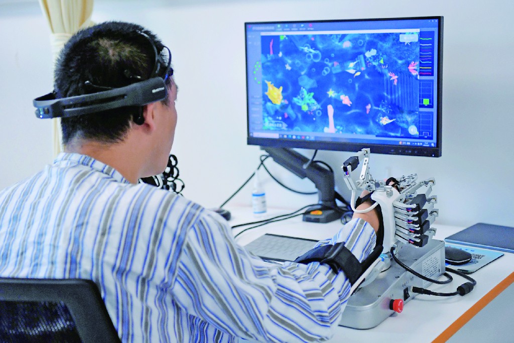 我叫孙涛,今年38岁,是一名脑梗死患者。每周我都会去重庆市第五人民医院康复中心的治疗室里“抓鱼”:我头戴像耳机一样的脑电采集器,手臂贴着电刺激仪,盯着电脑屏幕里游来游去的小鱼——跟着“抓鱼”的提示,我在心里使劲“想”:抓住小鱼!捏紧拳头!下一秒,右手真的缓缓收拢,屏幕上的小鱼被我稳稳“抓住”,治疗师符双娜在旁边笑着喊:“对!就是这个劲儿!”