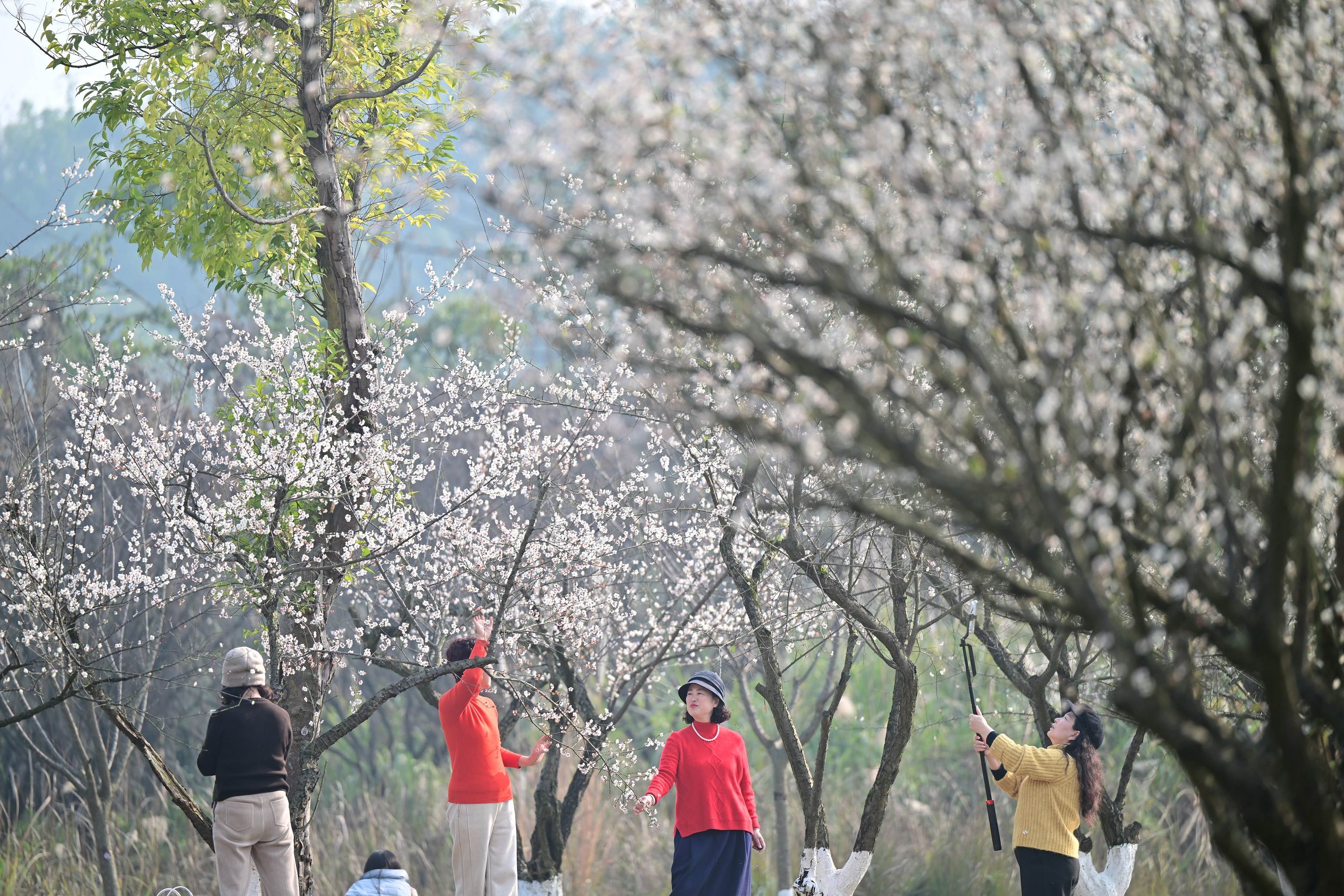 1月13日,冬日暖阳,广阳岛千株梅树已然开花。粉白点缀于起伏的草甸与江岸之间,为这座“重庆人工智能湾区”的生态绿芯,渲染上一抹温柔亮色。游人循香而至,传统花意与智能湾区的轮廓在此悄然对话——梅香邀客,亦是科技湾区向春天发出的灵动诗笺。