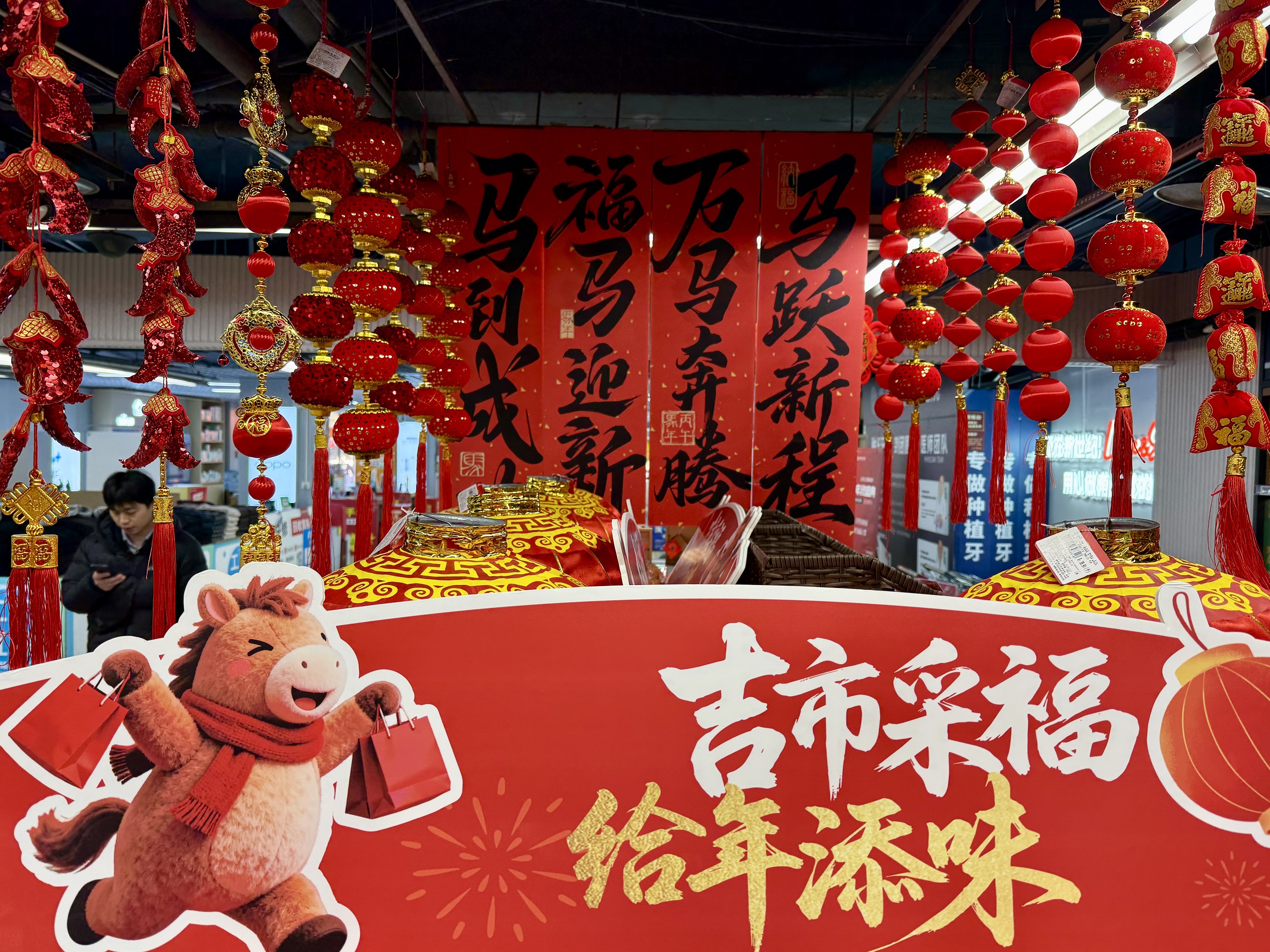 1月22日,随着农历马年日益临近,南岸区各大超市、商场内一片红火,以“马到成功”“马上有福”等吉祥寓意为核心的马年新春饰品持续走俏。各种造型的马元素饰品备受青睐,吸引民众驻足挑选,增添了浓浓的新春气息。