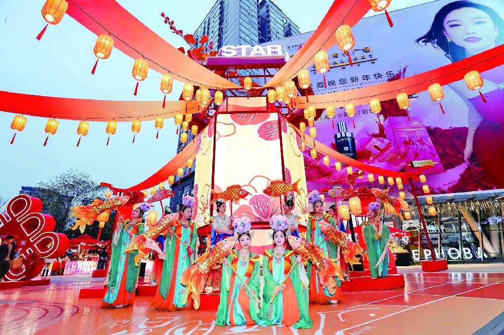 近日,南坪商圈星光时代广场推出8米高新春走马灯,巨幅灯饰流光溢彩,成为商圈视觉焦点。传统与现代交融的设计,吸引市民驻足留影,烘托出浓厚喜庆的春节氛围,映照出商圈的热闹与活力。