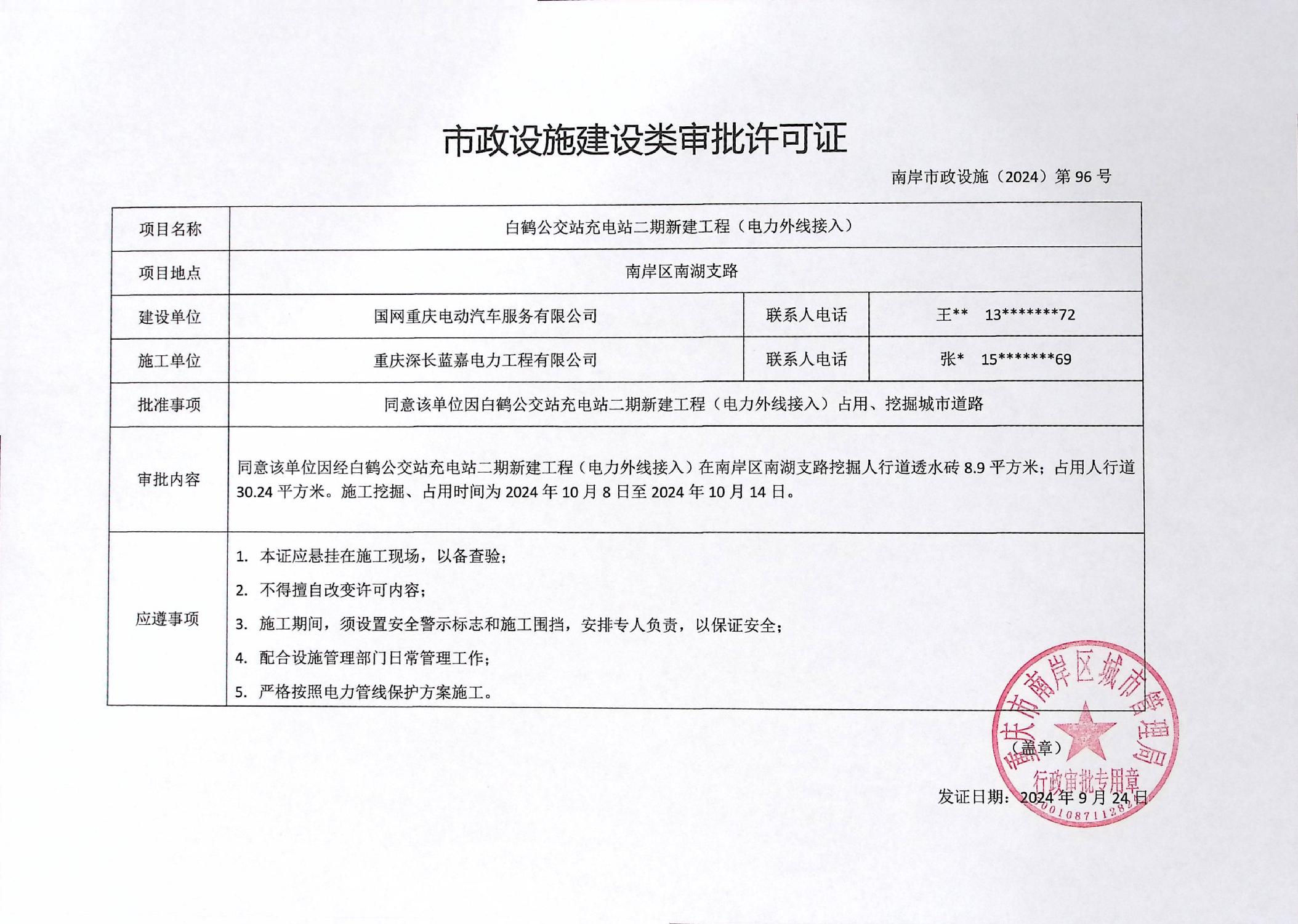 南岸市政设施(2024)第96号-白鹤公交站充电站二期新建工程(电力外线接入)