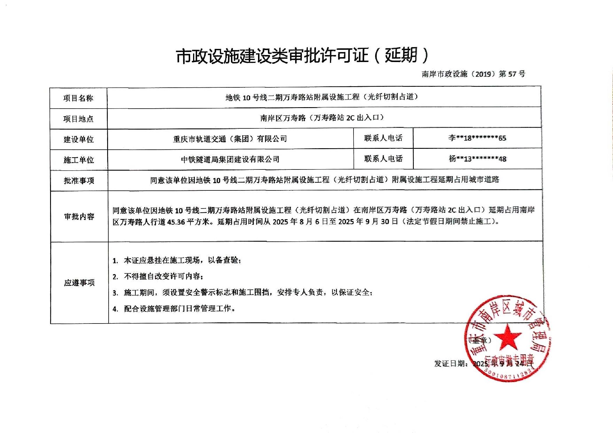 南岸市政设施(2019)第57号(延期)-地铁10号线二期万寿路站附属设施工程(光纤切割占道)