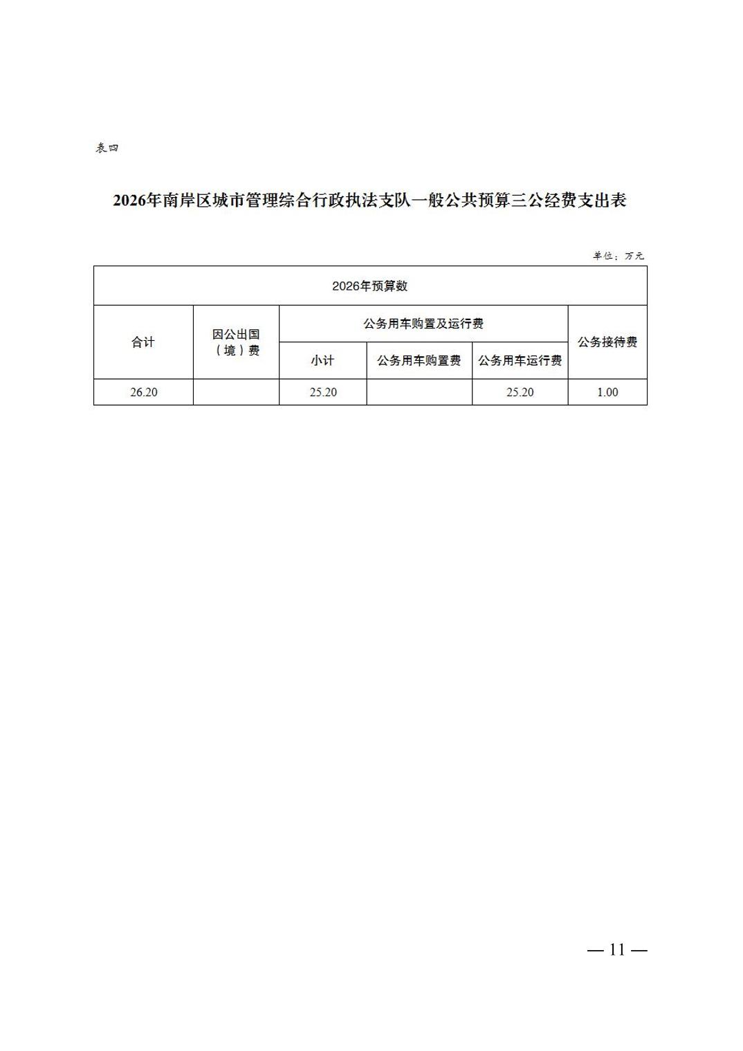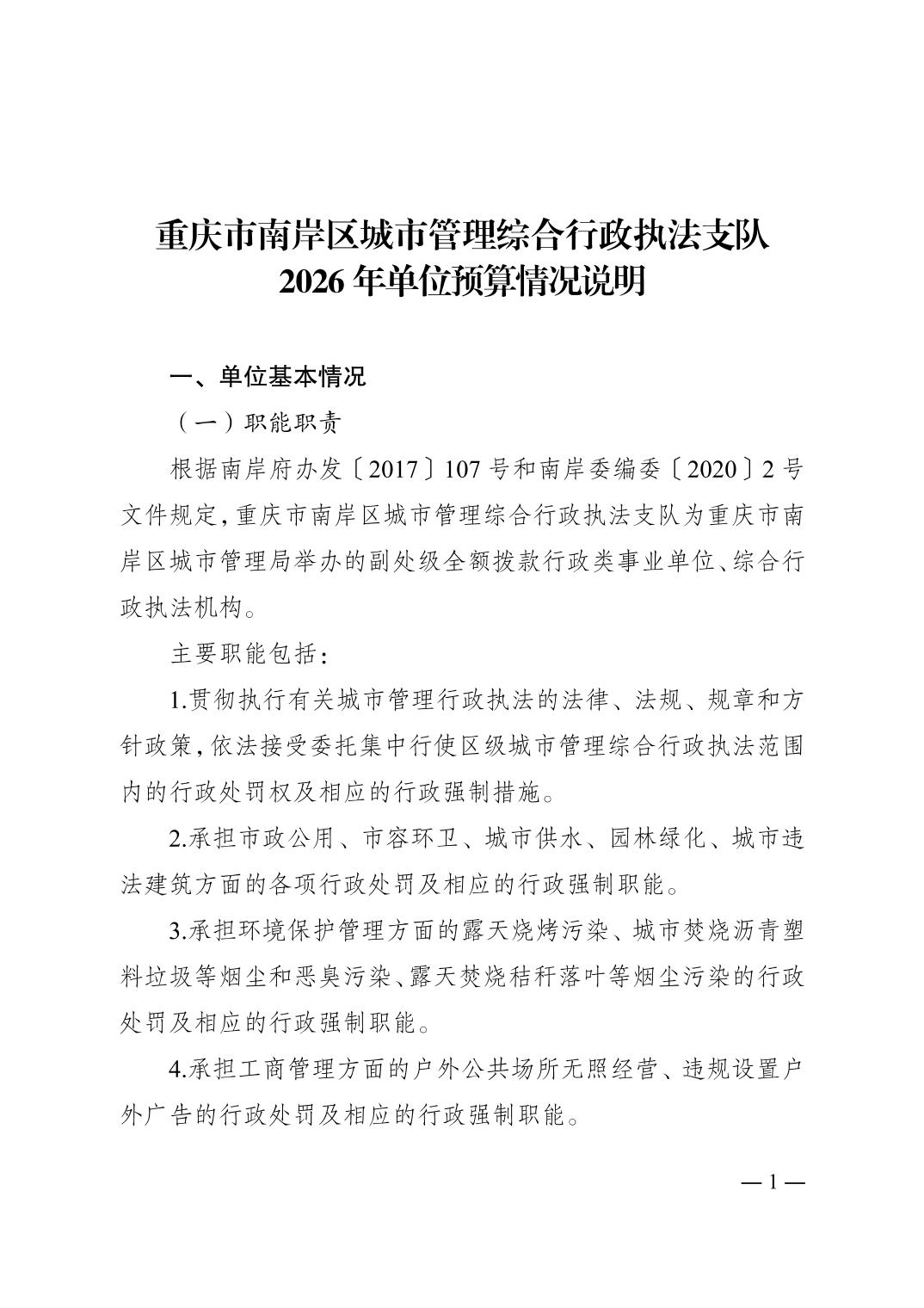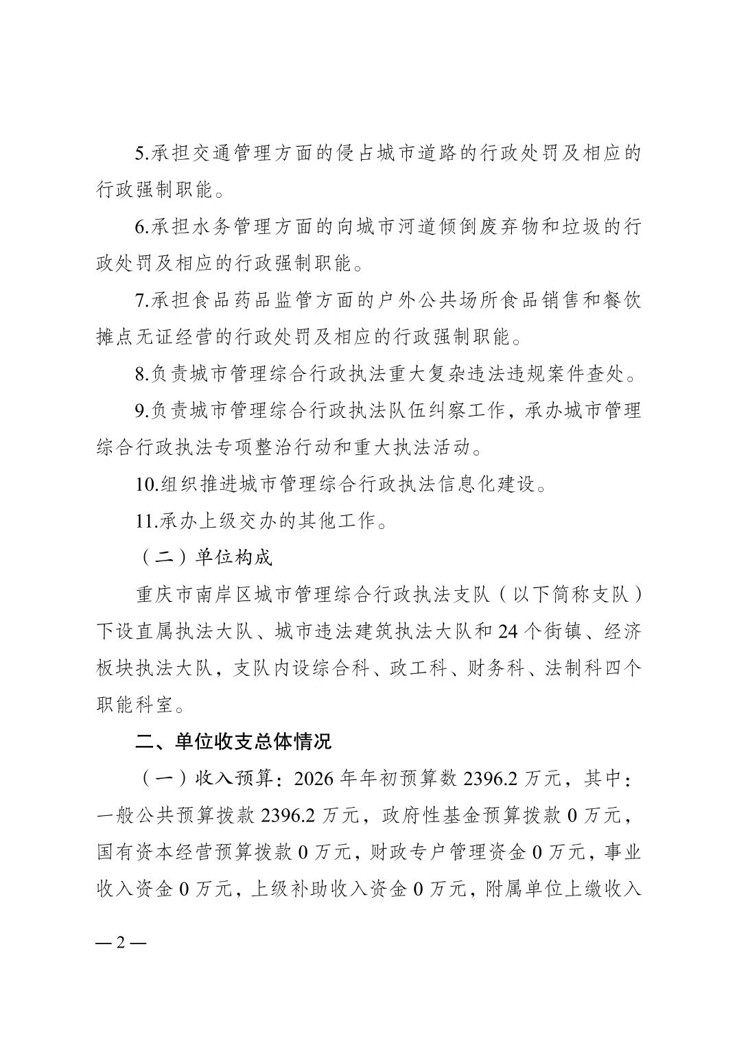 重庆市南岸区城市管理综合行政执法支队2026年单位预算情况说明