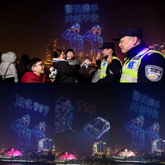 1月10日中国人民警察节当晚,“新韵重庆”无人机灯光秀常态化展演展出含有警察元素的灯光丽景,致敬第六个中国人民警察节,为这个特殊节日增添了特殊光彩,让广大民警辅警倍感温暖、倍受鼓舞。