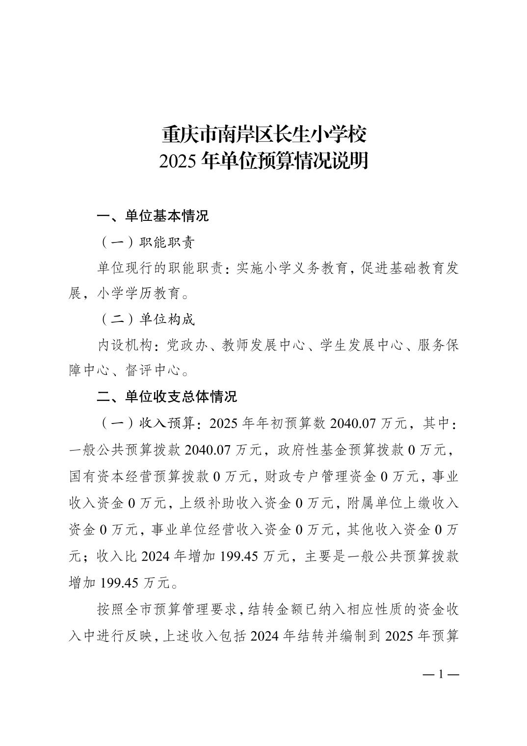 重庆市南岸区长生小学校2025年单位预算情况说明