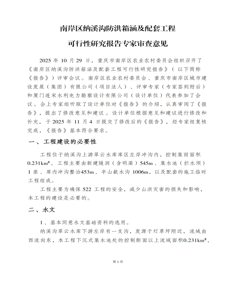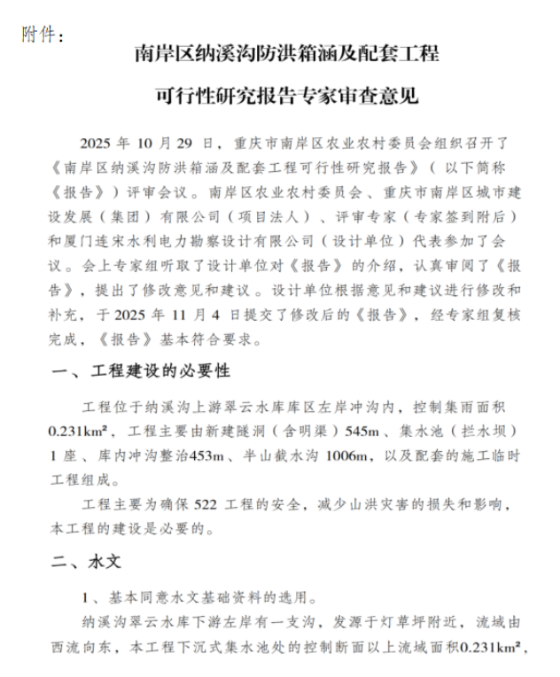收悉重庆市南岸区城市建设发展(集团)有限公司报送的《南岸区纳溪沟防洪箱涵及配套工程可行性研究报告审批的请示》(南城建司文〔2025〕218号)后,我委于10月29日组织专家对《南岸区纳溪沟防洪箱涵及配套工程可行性研究报告》( 以下简称《可研报告》)进行了技术评审,并提出了修改补充意见;11月4日,项目法人向我委报送了修改完善后的《可研报告》,经专家组复核,认为《可研报告》基本满足现行规范的编制要求,并形成了专家评审意见(详见附件)。