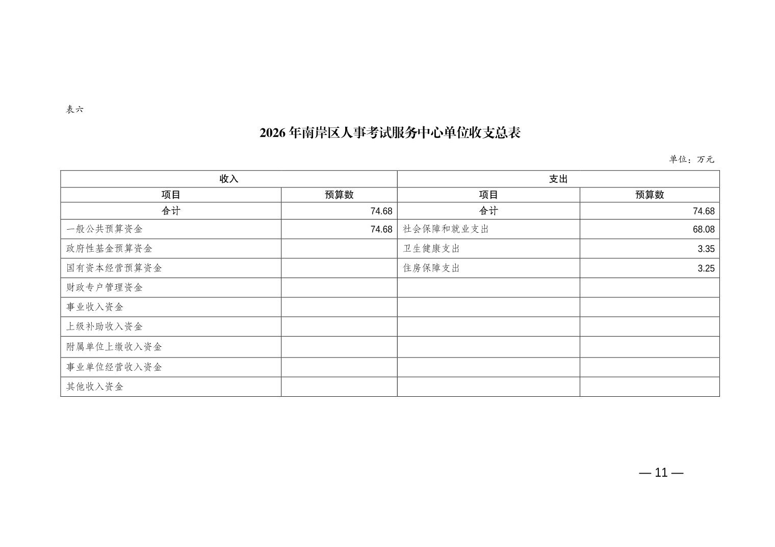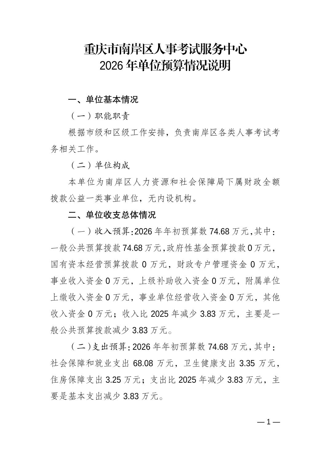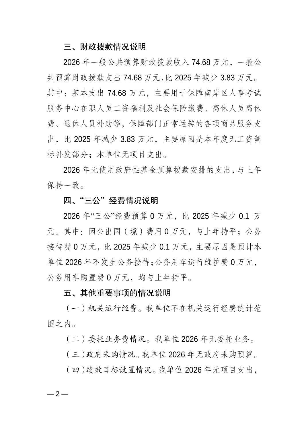 重庆市南岸区人事考试服务中心2026年单位预算情况说明
