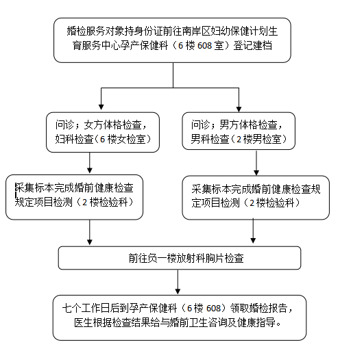 1.南岸区妇幼保健计划生育服务中心(南岸区海棠溪烟雨路410号附2号)六楼608室,检查时间每周一至周六8:30-12:00。