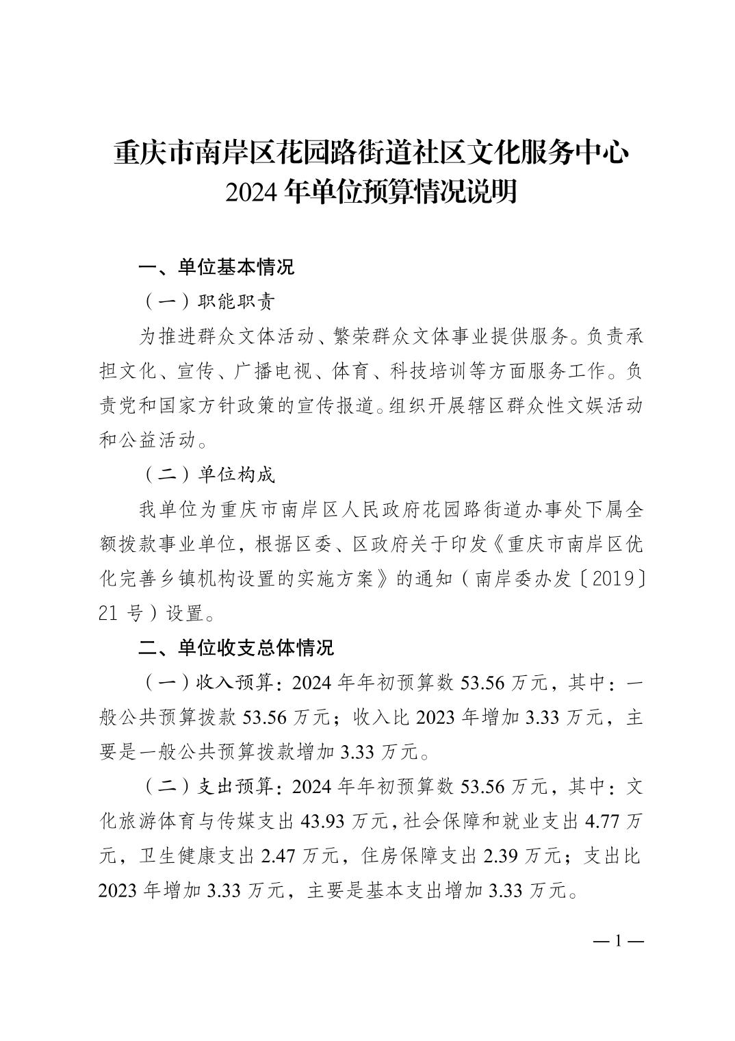 重庆市南岸区花园路街道社区文化服务中心2024年单位预算情况说明