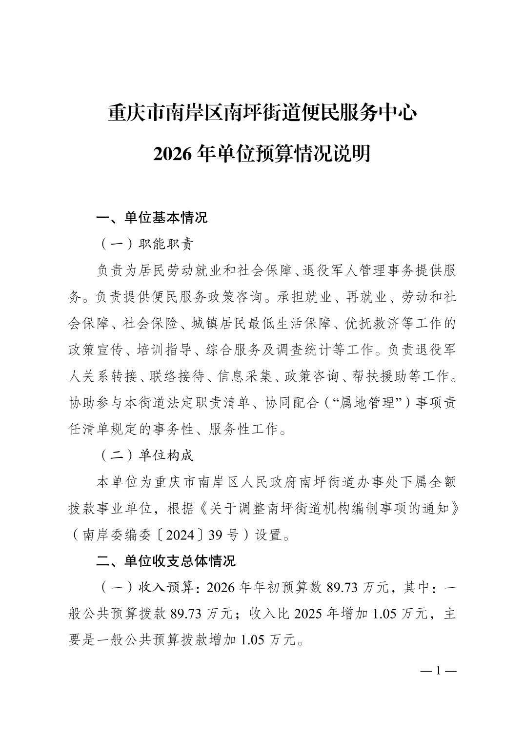重庆市南岸区南坪街道便民服务中心2026年单位预算情况说明