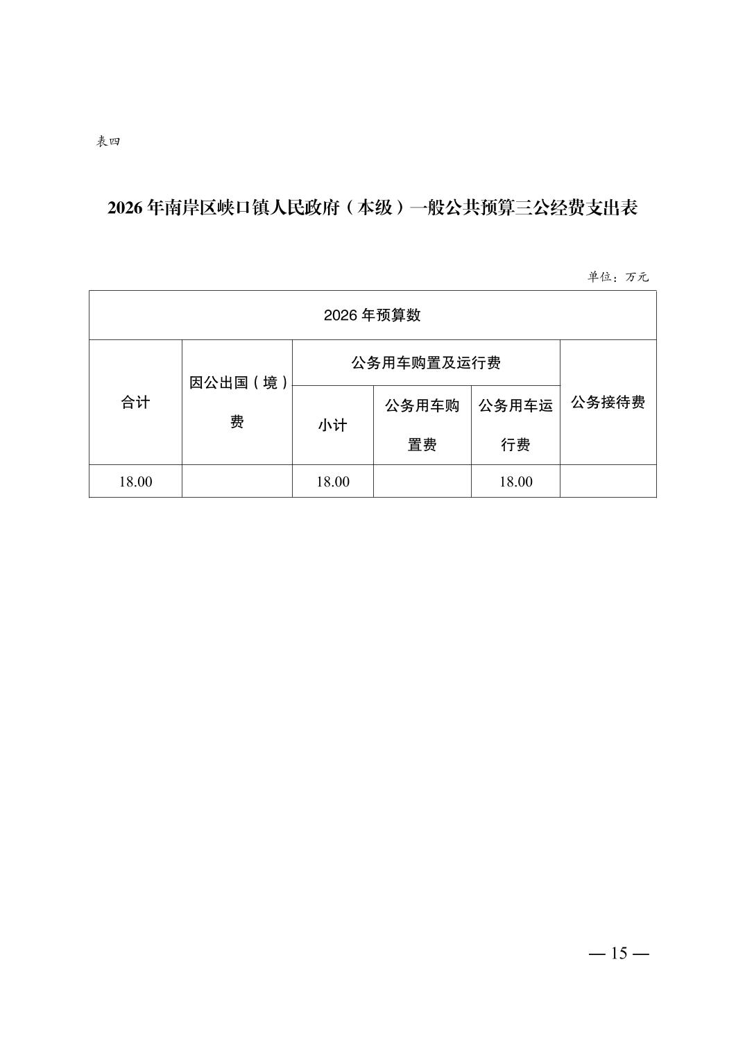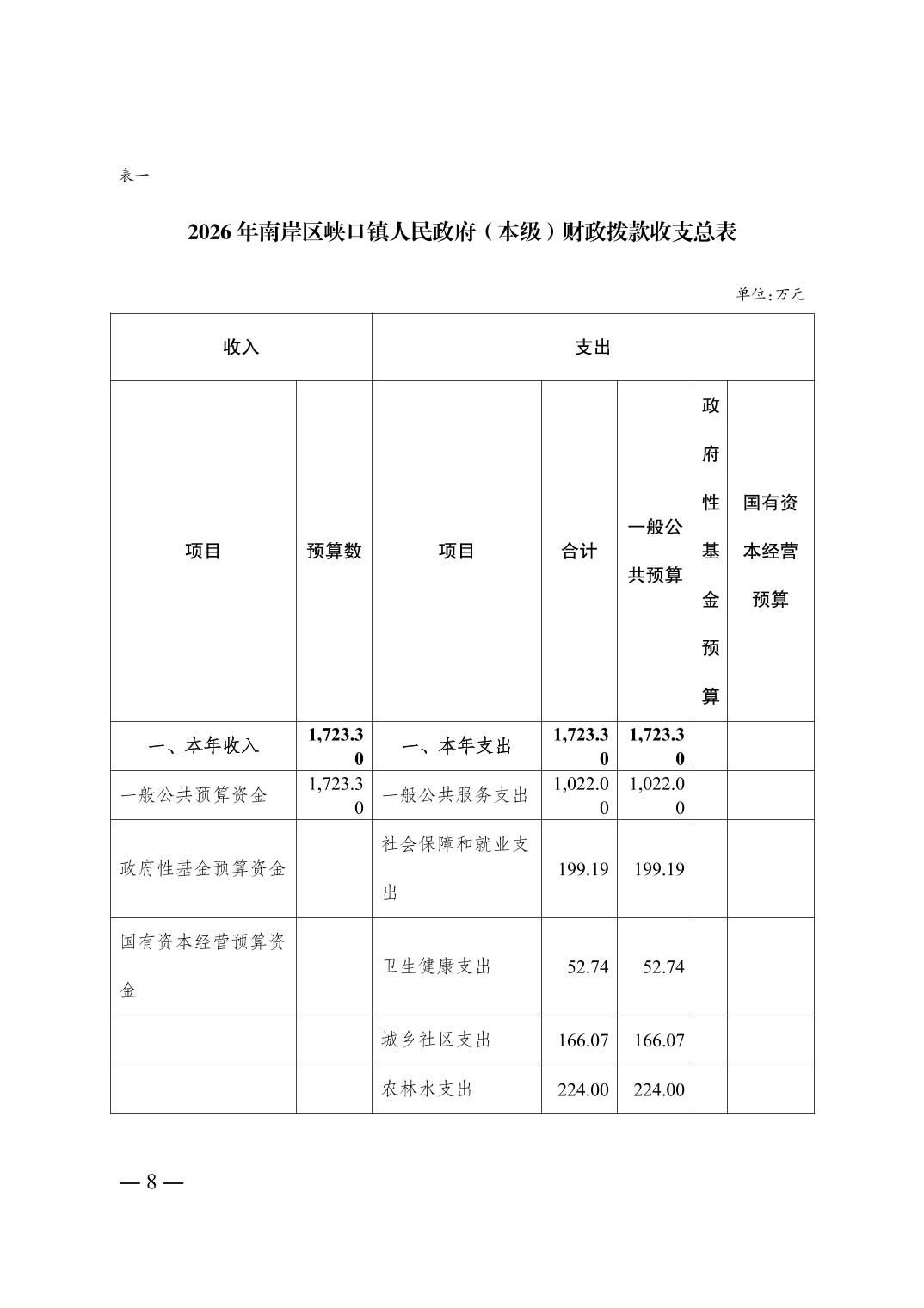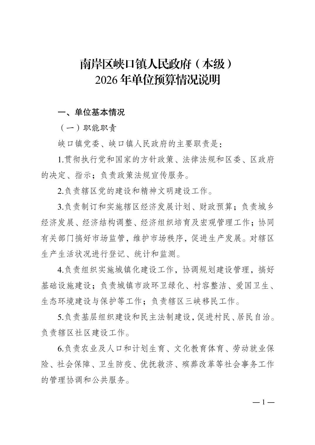重庆市南岸区峡口镇人民政府(本级)2026年单位预算情况说明