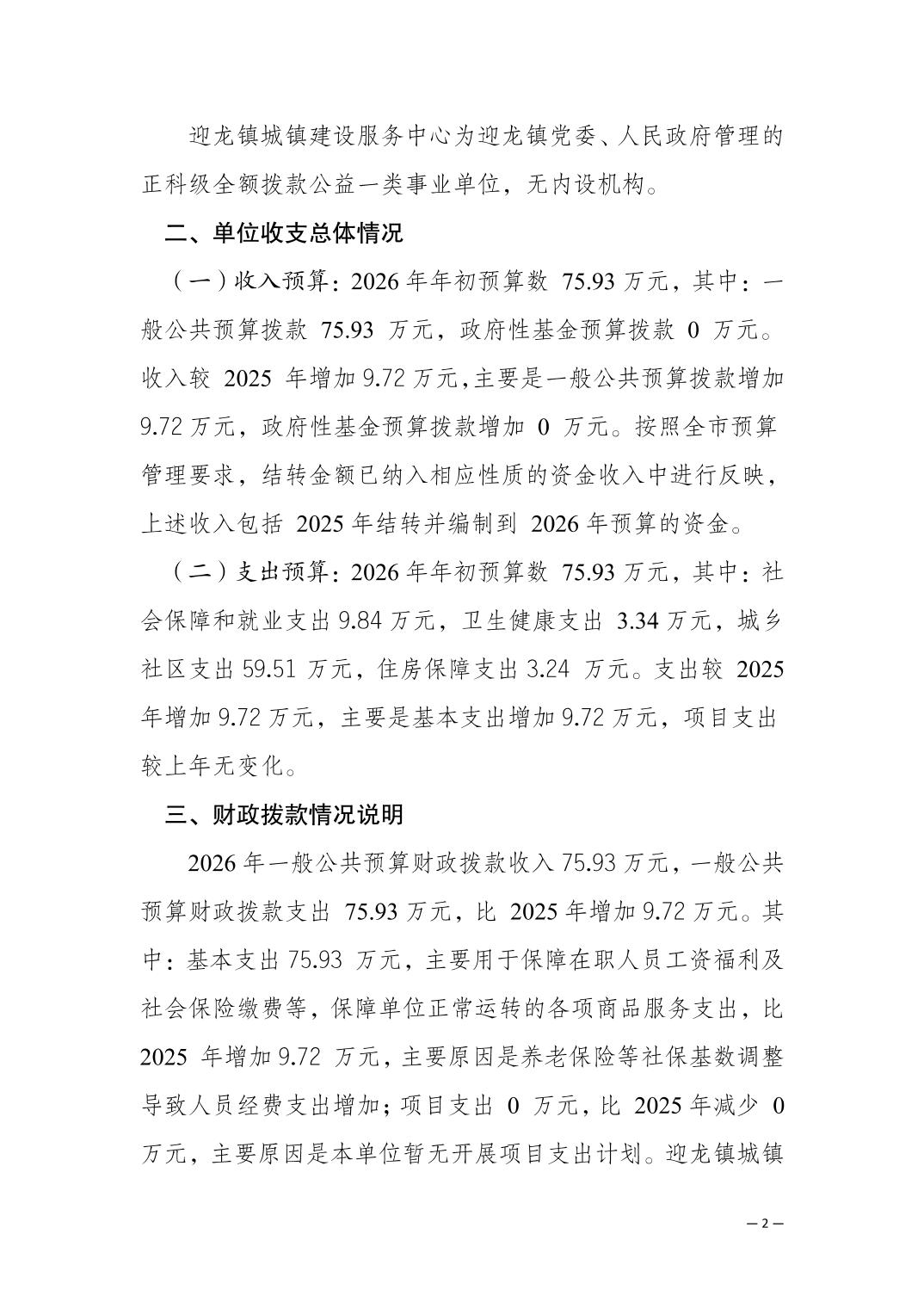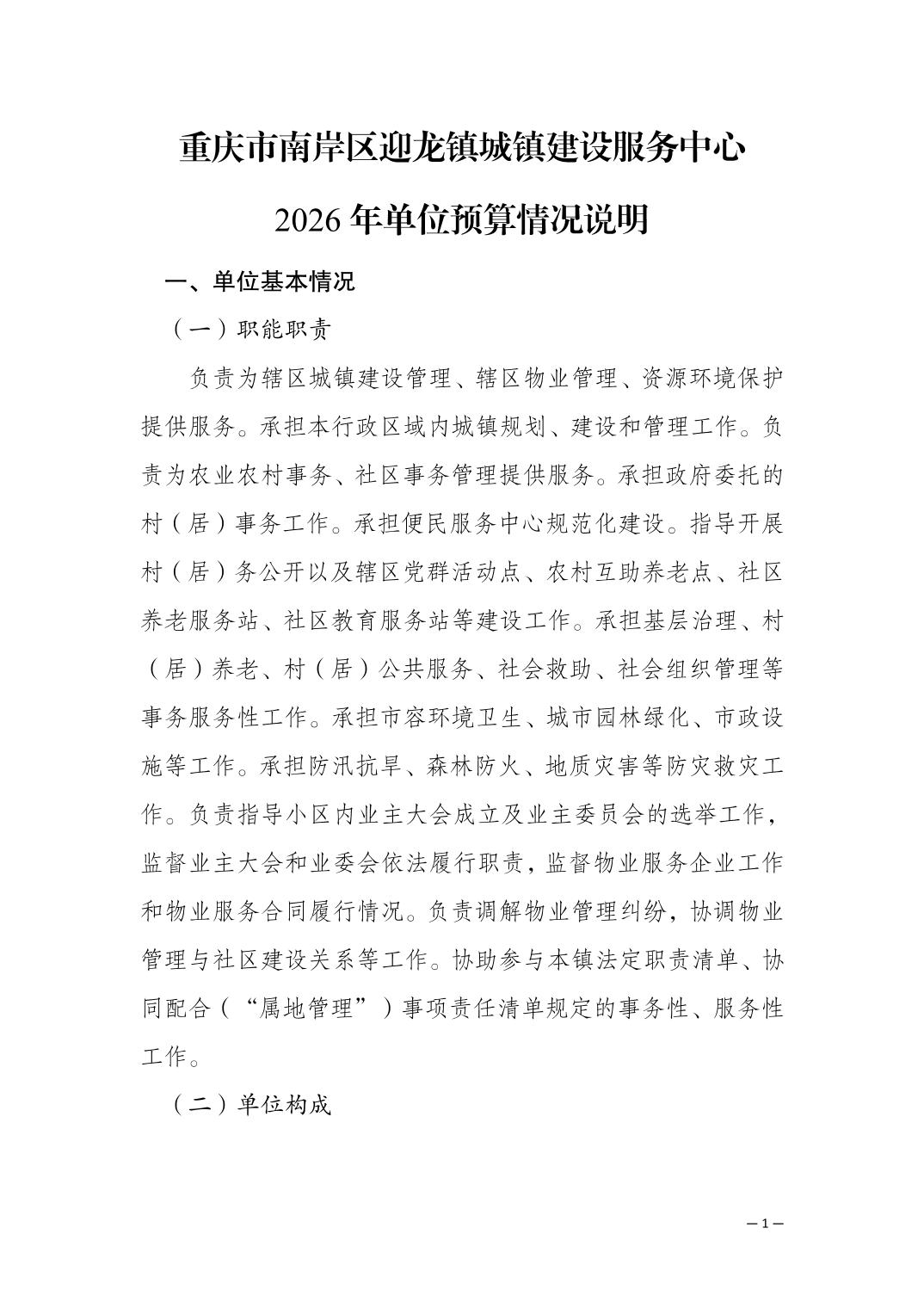 重庆市南岸区迎龙镇城镇建设服务中心2026年单位预算情况说明