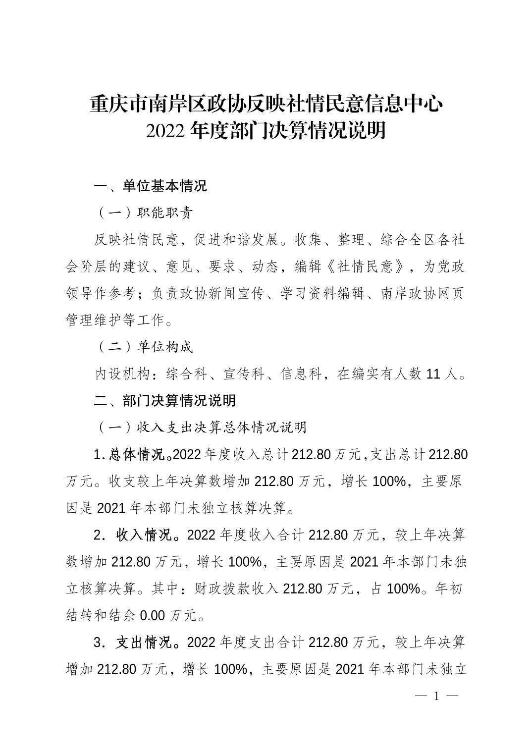 重庆市南岸区政协反映社情民意信息中心 2022 年度部门决算情况说明