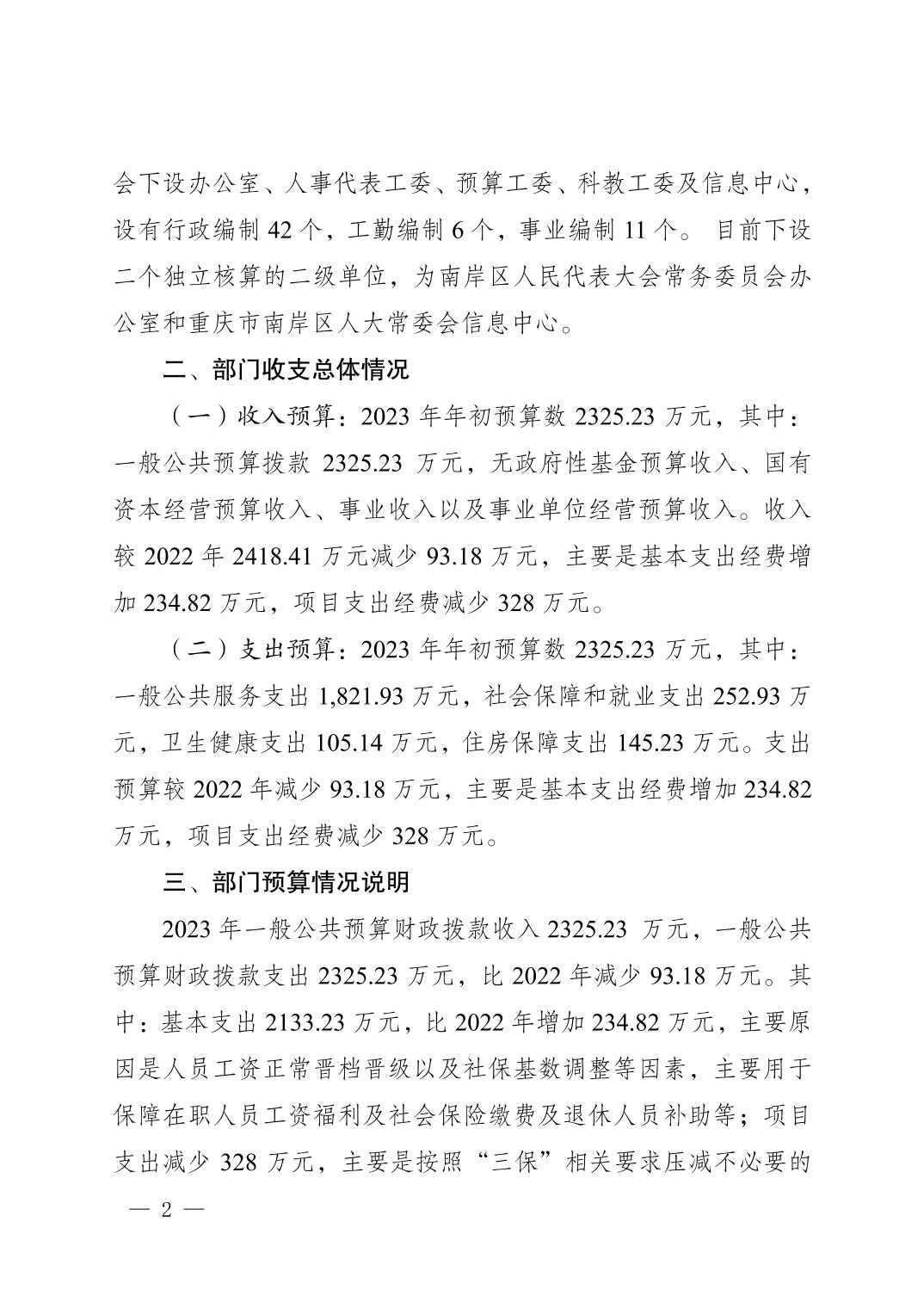 重庆市南岸区人民代表大会常务委员会办公室 2023 年部门预算情况说明