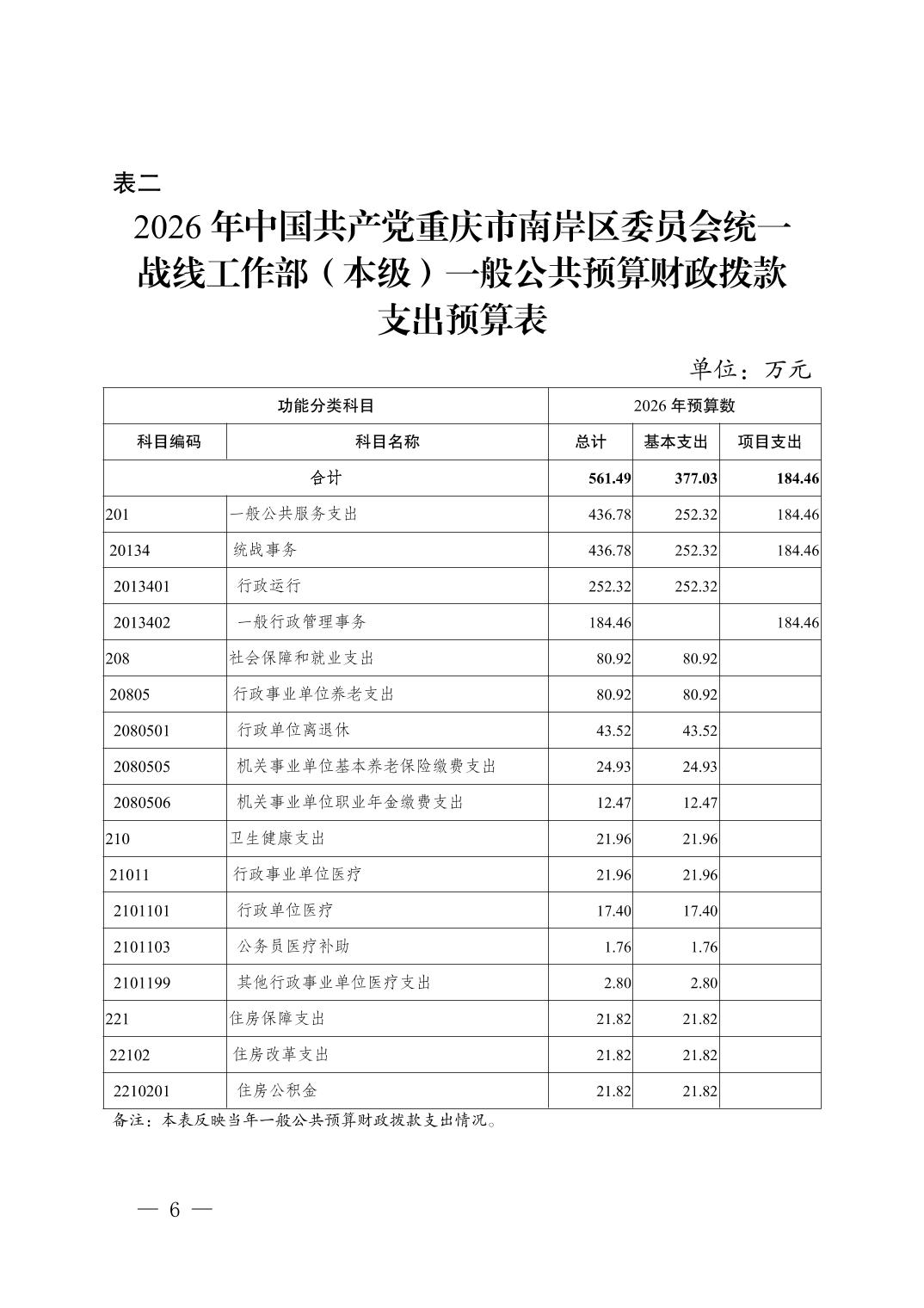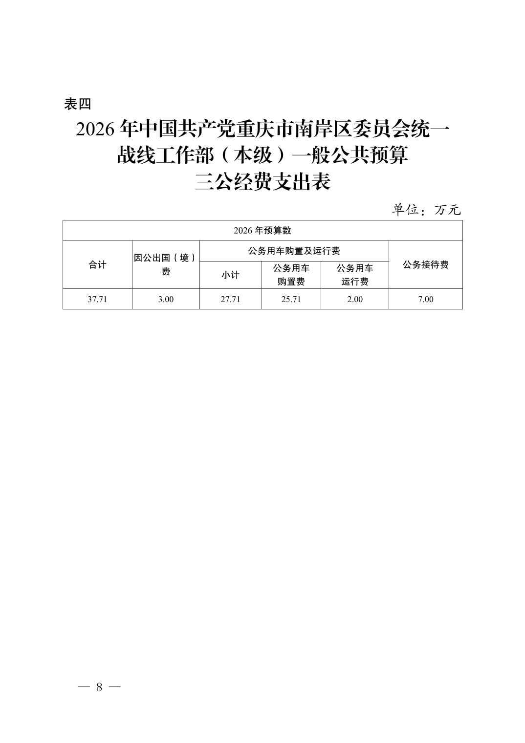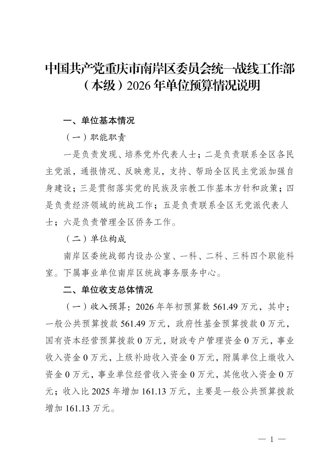 中国共产党重庆市南岸区委员会统一战线工作部(本级)2026年单位预算情况说明