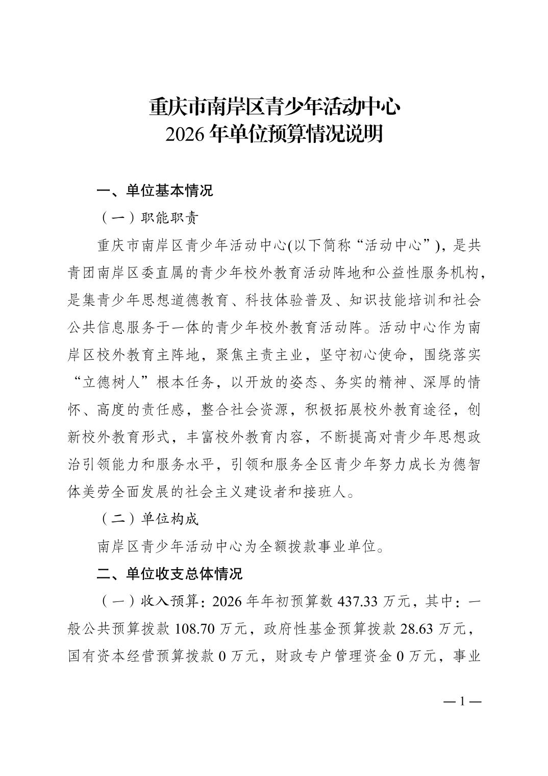 重庆市南岸区青少年活动中心2026年单位预算情况说明