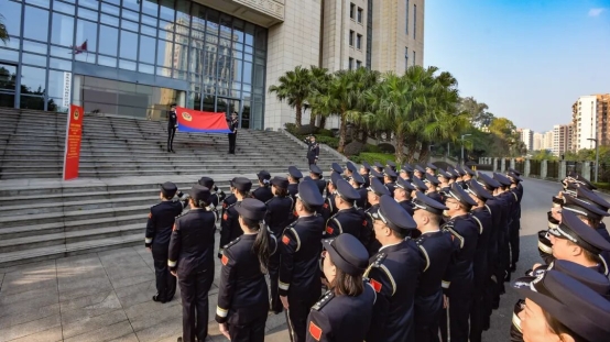 节日前夕,分局在机关大院组织开展重温入警誓词宣誓活动,60名民警代表在红蓝相映的猎猎警旗下整齐列队。在冬日和煦阳光下,全体人员面向警旗,高举右拳,重温公安机关人民警察誓词。“我是中国人民警察,我宣誓……”铮铮誓言响彻现场,充分表达了全体民警忠诚于公安事业的坚定信念,以及维护社会安全稳定的坚强决心。与此同时,分局交管支队、刑侦支队、警卫支队、法制支队、看守所,南坪派出所、茶园派出所、南山派出所、花园路派出所、弹子石派出所、迎龙派出所、南坪镇派出所、长生桥派出所、广阳派出所、天文派出所,交管南山大队、弹子石大队、茶园大队等单位结合工作实际,自行组织民警辅警开展升警旗、唱警歌、重温公安机关人民警察誓词、座谈会、主题党日活动、民警荣退仪式等形式多样、丰富多彩的系列庆祝活动,进一步锻造忠诚警魂,激励警心斗志。