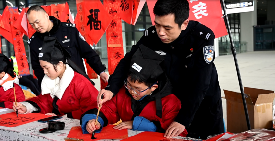 “辞旧迎新好气象,交通安全共参与”“爆竹声声辞旧岁,文明驾驶迎新春” ……一副副喜庆春联、大红福字从民警手中泼墨而出。分局民警、重庆公安文联书法美术协会副主席于超正与书院小小志愿者们一起挥毫,将交通安全方面的美好祝福亲手赠予途经重庆东站的旅客和返乡市民。
