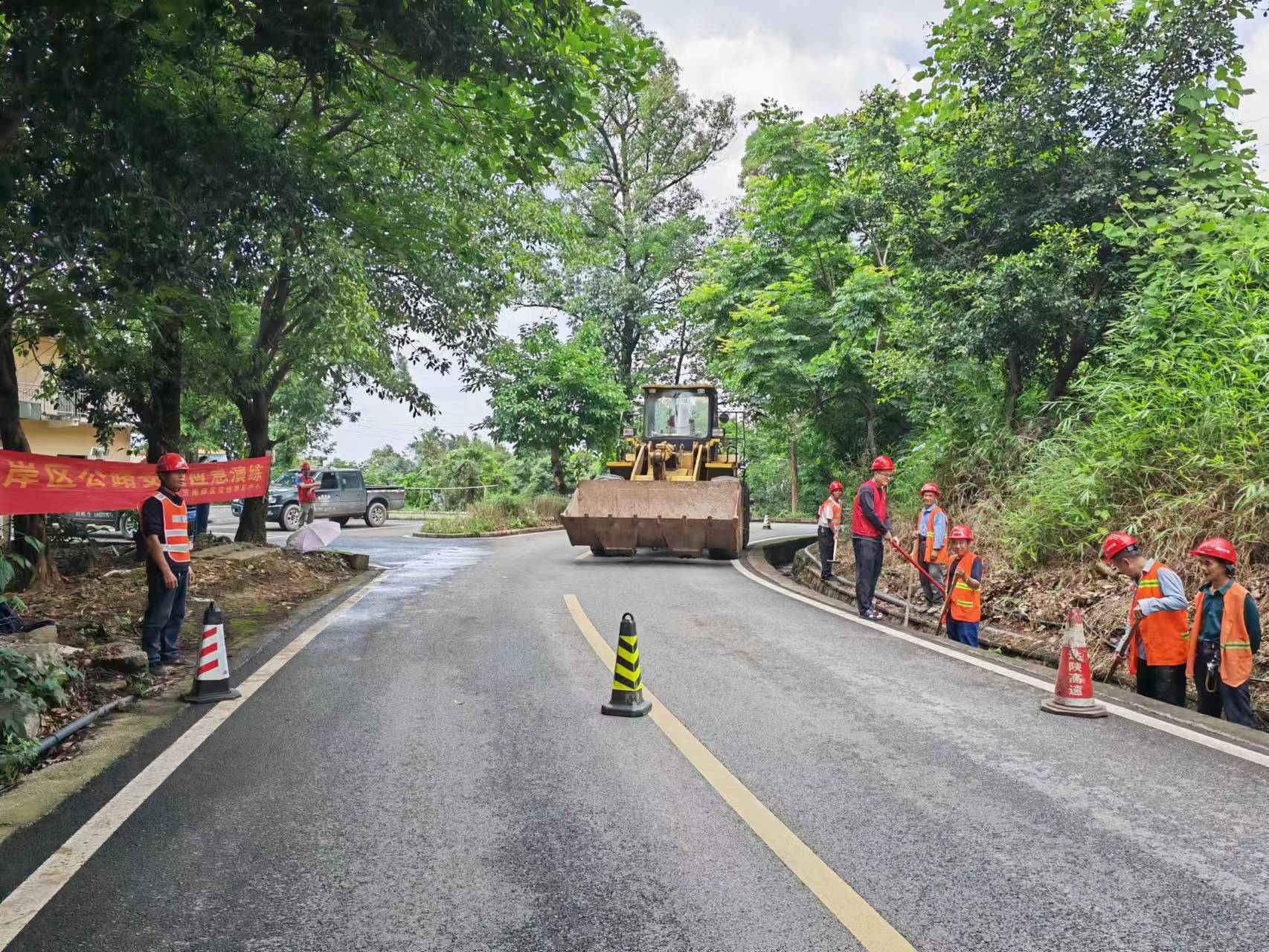 近日,南岸区交通事务中心在辖区石冷路开展公路抢险应急演练。演练开始,石冷路K3+200段因持续降雨产生山体滑坡险情。接到值班室报告后,总指挥部立即按照应急预案启动四级响应,南岸区交通事务中心第一时间组织抢险队伍赶赴现场。现场道路封闭、机械清堵等工作有条不紊进行。一个小时后道路抢通,险情处理完毕。车辆指挥人员有序放行过路车辆,演练圆满结束。