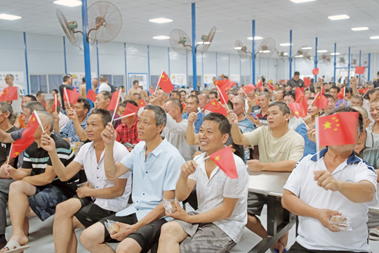 中秋、国庆前夕,重庆东站项目部组织工人收看爱国电影,丰富工人业余生活。 记者 郭旭 摄