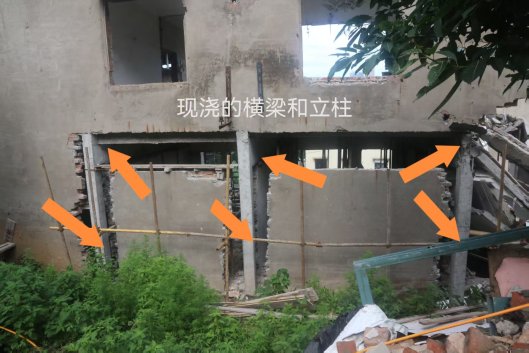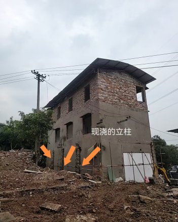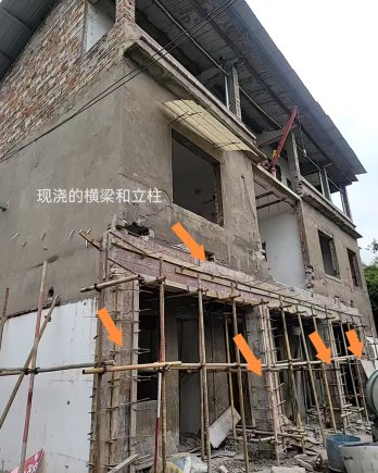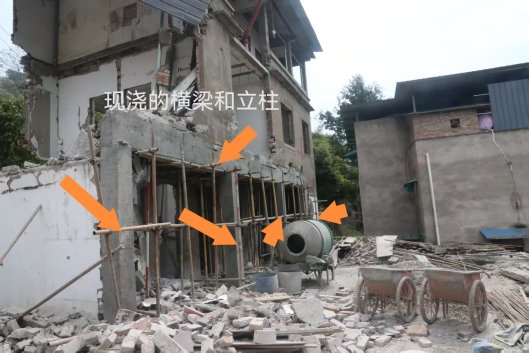 事故地点位于重庆市南岸区涂山镇莲花村莲花石社1号附200号房屋,该房屋系老旧农村自建房,三层楼,砖混结构,楼板为混凝土预制板。坍塌前的施工作业情况:1楼顶部大部分用钢管架进行了支护,房屋正面拆除部分构筑物后现浇了1根横梁及4根立柱,房屋后面及内部拆除了部分构筑物后现浇了3根立柱和3根横梁。(见组图1)