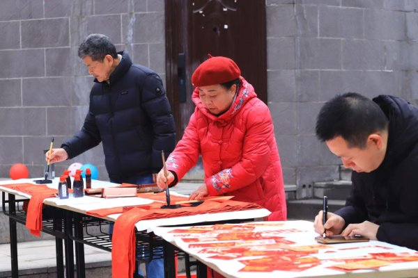 活动现场洋溢着喜庆祥和的节日气氛。歌舞表演引来阵阵欢笑与掌声,居民们热情参与写春联、品腊八粥等环节,彼此送上真挚的新年祝福,共同期盼美好生活。一碗碗暖粥,一副副红联,传递着节日的温暖,更串联起社区邻里间的深情厚谊。
