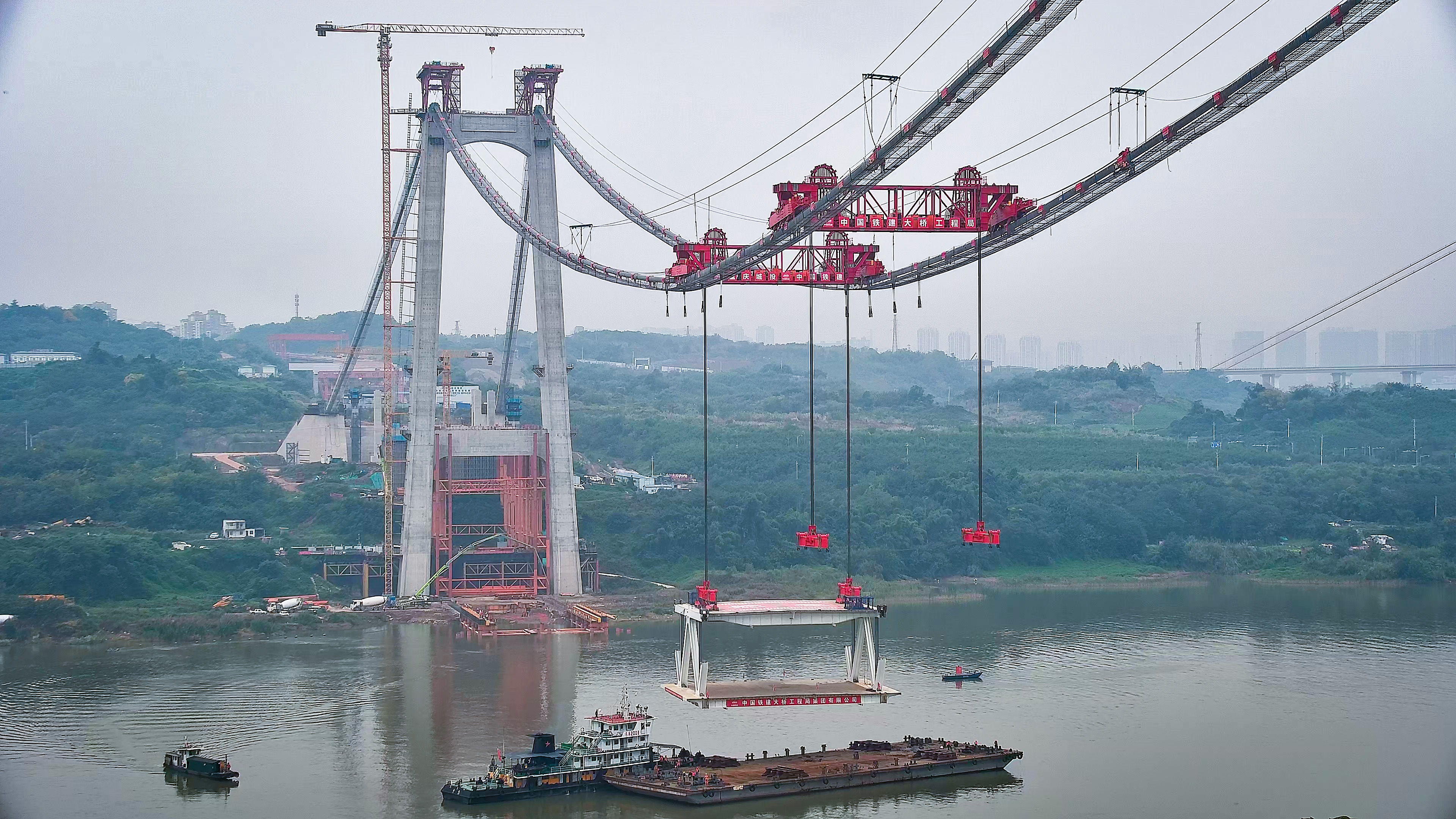 黄桷沱长江大桥完成首节钢桁梁吊装。