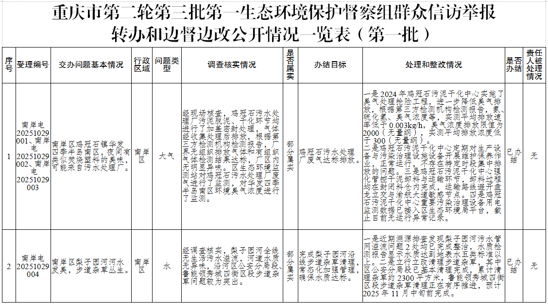 重庆市第二轮第三批第一生态环境保护督察组群众信访举报转办和边督边改公开情况一览表(第一批)