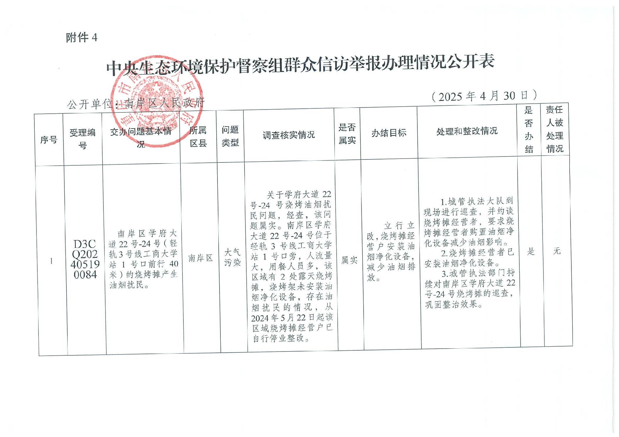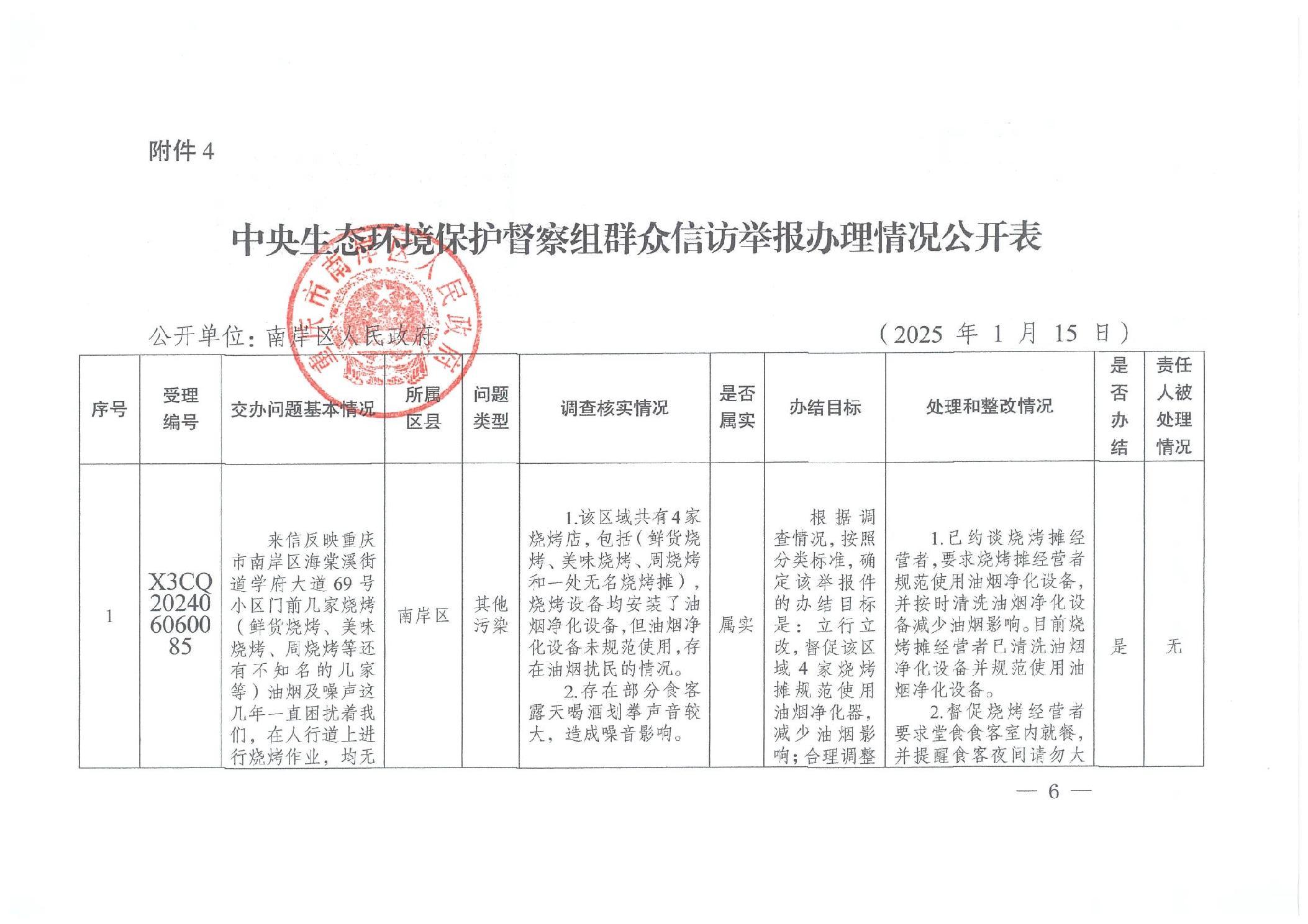 中央生态环境保护督察组群众信访举报办理情况公开表(D3CQ202405110019、X3CQ202406030058、X3CQ202406060085、X3CQ202406080152、D3CQ202405280068、D3CQ202405190084)